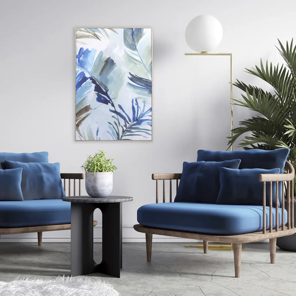 A blue palm print that has a hand applied acrylic overlay. This non glass item has a white wash frame.