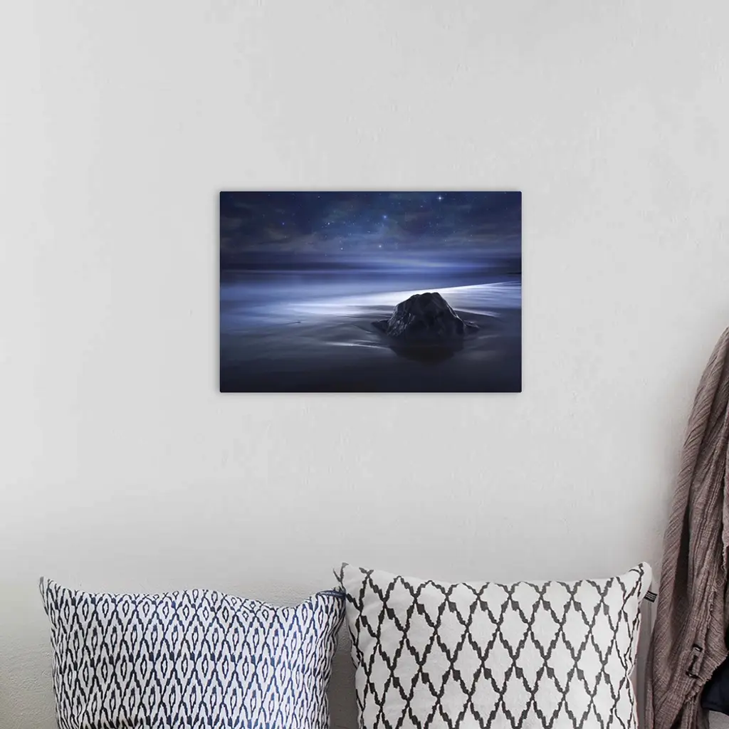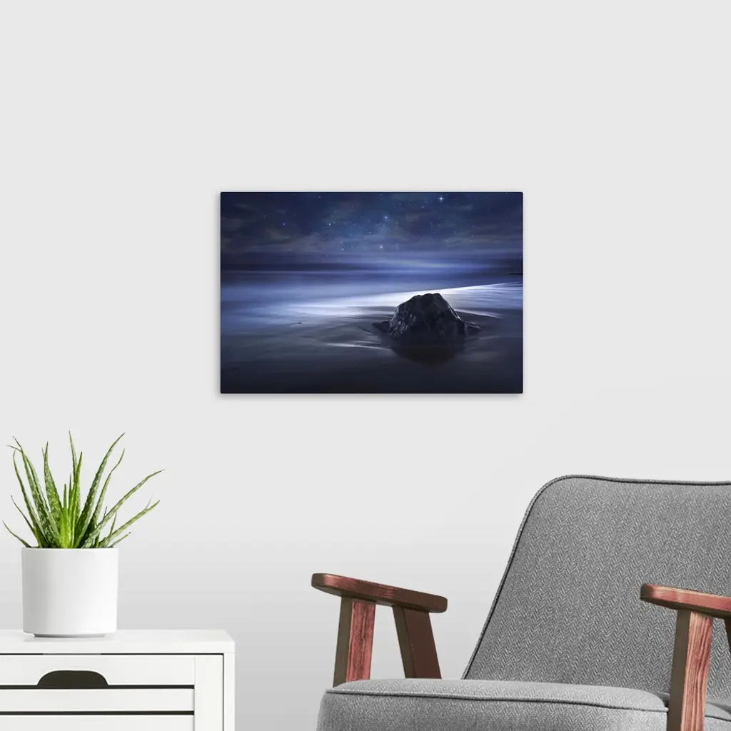 A rock on the beach in sand which appears smooth, under a starry night sky.