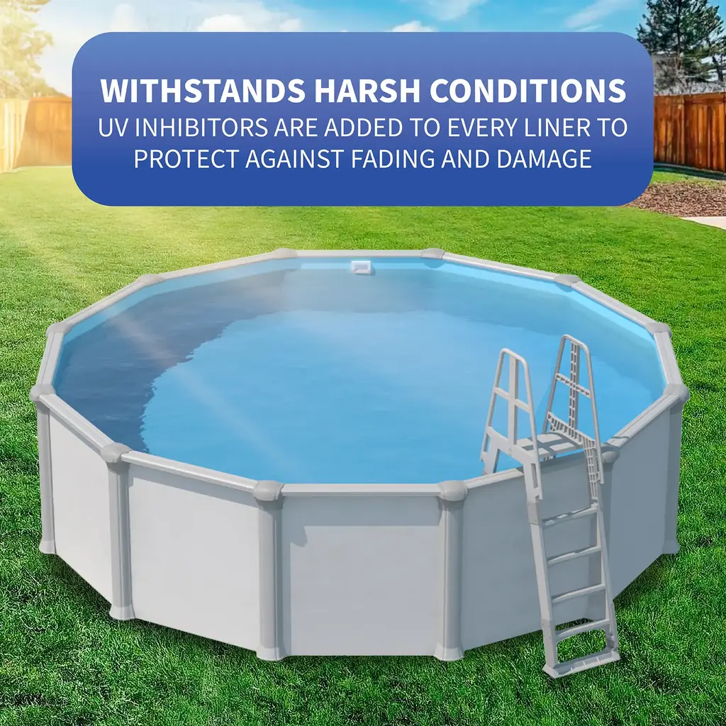 Enhance the timeless appeal of your above-ground pool with this vibrant, solid-blue vinyl liner. Its borderless design is simple and classic, making it an ideal choice for any pool. Made from premium, standard-gauge vinyl, this liner features UV inhibitors to protect against fading and damage from sunlight and water. The welded seams ensure a smooth surface and long-lasting durability. Backed by a 15-year warranty.