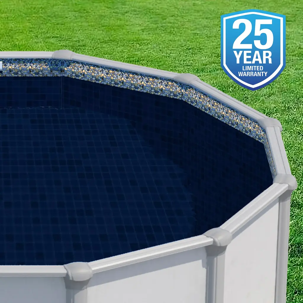 Drawing inspiration from the smooth stones found in riverbeds, the Canyon Overlap Liner boasts rich, vibrant colors that will introduce a dynamic, natural touch to your pool. The liner features a unique mosaic of multi-colored rocks, creating an eye-catching border that frames a wall and floor with a pattern of deep blue tiles. Crafted from heavy-gauge, premium vinyl, it includes UV inhibitors to guard against fading and damage from harsh pool conditions. Welded seams ensure a smooth surface and provide years of durability. Backed by a 25-year warranty.