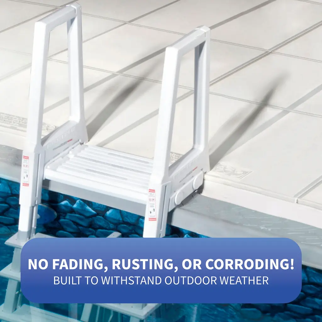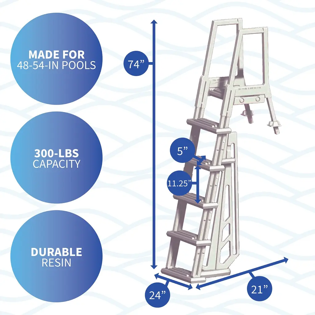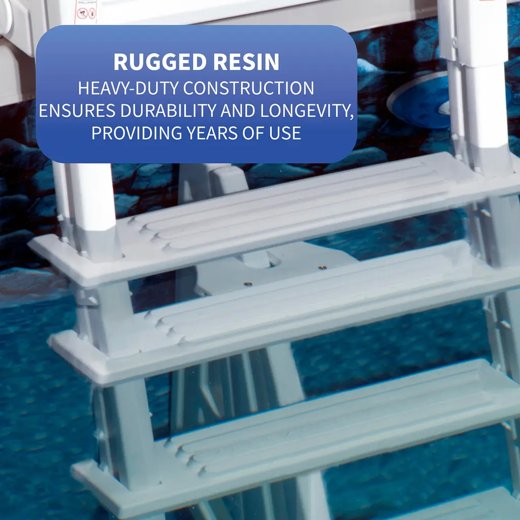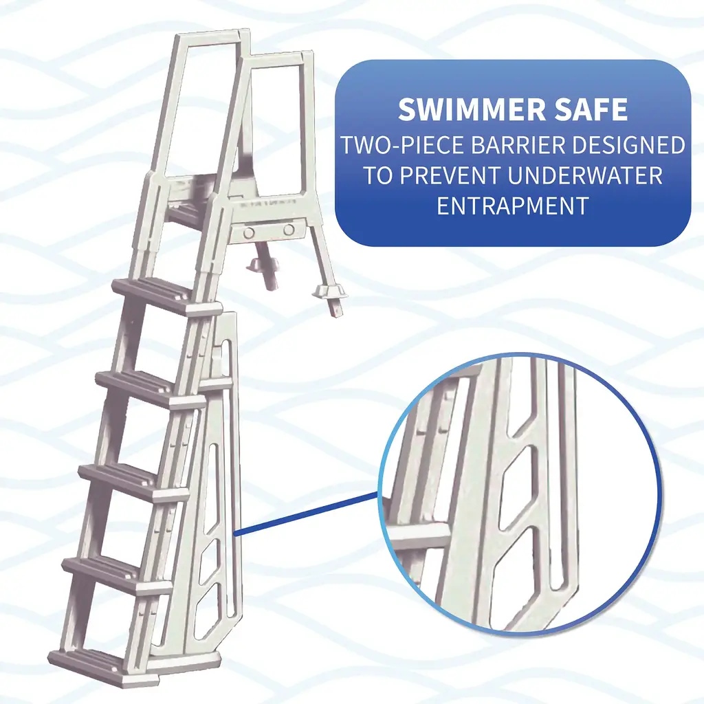 Provide an easy way to enter and exit your above-ground pool with the Heavy-Duty In-Pool Ladder. This durable, injection-molded resin in-pool ladder features 6-in deep, non-skid treads with an extra, fifth tread for easier climbing than with a standard four-tread pool ladder. For additional safety and security, a two-piece anti-entrapment barrier ensures that no one swims through, around, or behind the ladder while in the pool. Mounts easily to any deck with included mounting blocks. Supports up to 300-lbs. 3-year limited warranty.