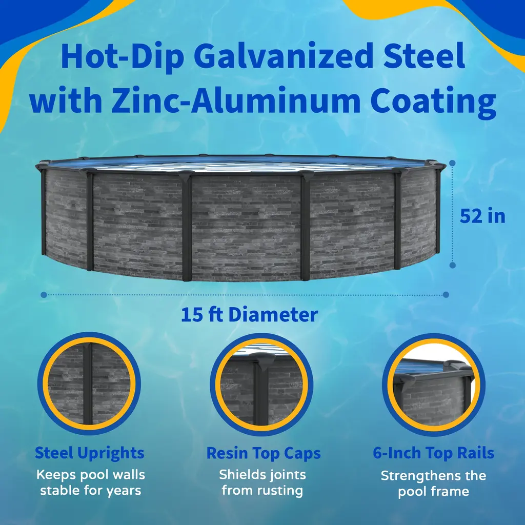 The Marbella Above-Ground Pool is a complete backyard pool solution designed for long-lasting summer fun. Constructed with hot-dip galvanized steel, this steel frame pool set features a zinc-aluminum coating for superior corrosion resistance. Its 6-inch steel top rails, reinforced uprights, and resin top caps ensure durability against the elements, while the weather-resistant liner provides additional protection. This above ground swimming pool offers plenty of space for relaxation and recreation, making it perfect for families. Designed for efficiency, the Marbella above ground pool includes a Sandman sand filter pump for above ground pool effectively circulates water, maintaining clean, crystal-clear water with minimal upkeep. The above ground pool skimmer and wide-mouth return system enhance filtration, ensuring optimal water quality in swimming pools above ground. Safety and convenience are top priorities, with a sturdy above ground pool ladder featuring flip-up steps and a two-piece barrier to prevent unauthorized access. The pools for backyard package also includes a full pool accessories kit with a vinyl liner vacuum head, test strips, a leaf skimmer, and more.COMPLETE ABOVE GROUND POOL SET – Enjoy an all-in-one backyard retreat with the Marbella oval pool. With a 52-in deep steel wall includes a skimmer, sand filter, overlap liner, A-frame ladder, and maintenance kit. HEAVY-DUTY STEEL WALL – Built with 6-in top rails and 5-in steel verticals for lasting strength. .39mm galvanized steel walls with zinc-aluminum coating ensure durability, while resin top caps resist rust and sun.SECURE A-FRAME LADDER – The resin A-frame ladder supports up to 250 lbs, with lockable, flip-up steps to prevent unwanted access. A wide, stable platform ensures easy entry and exit for all swimmers. LONG-LASTING QUALITY & 15-YEAR WARRANTY – Designed for quick assembly with clear instructions and all essential tools. Backed by a 15-year limited warranty. * Includes a 1-HP dual-speed motor with a 16,000-gallon turnover rate that circulates water at 3,720 gallons per hour**Includes a 1.5-HP dual-speed pump 24,000-gal turnover rate that circulates water at 4,500 gallons per hour