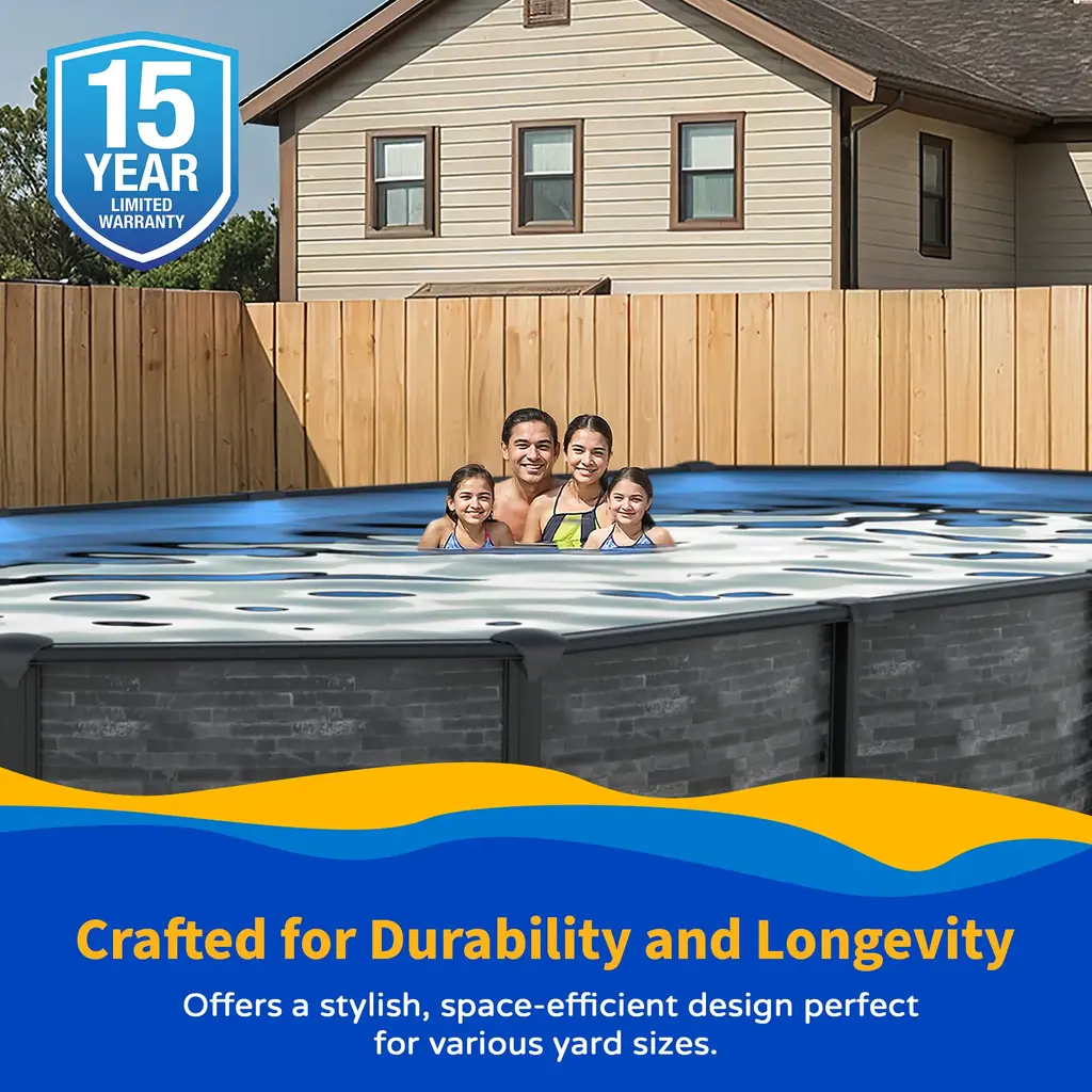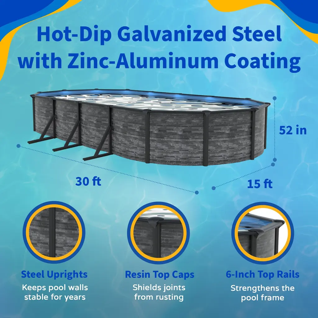The Marbella Above-Ground Pool is a complete backyard pool solution designed for long-lasting summer fun. Constructed with hot-dip galvanized steel, this steel frame pool set features a zinc-aluminum coating for superior corrosion resistance. Its 6-inch steel top rails, reinforced uprights, and resin top caps ensure durability against the elements, while the weather-resistant liner provides additional protection. This above ground swimming pool offers plenty of space for relaxation and recreation, making it perfect for families. Designed for efficiency, the Marbella above ground pool includes a Sandman sand filter pump for above ground pool effectively circulates water, maintaining clean, crystal-clear water with minimal upkeep. The above ground pool skimmer and wide-mouth return system enhance filtration, ensuring optimal water quality in swimming pools above ground. Safety and convenience are top priorities, with a sturdy above ground pool ladder featuring flip-up steps and a two-piece barrier to prevent unauthorized access. The pools for backyard package also includes a full pool accessories kit with a vinyl liner vacuum head, test strips, a leaf skimmer, and more.COMPLETE ABOVE GROUND POOL SET – Enjoy an all-in-one backyard retreat with the Marbella oval pool. With a 52-in deep steel wall includes a skimmer, sand filter, overlap liner, A-frame ladder, and maintenance kit. HEAVY-DUTY STEEL WALL – Built with 6-in top rails and 5-in steel verticals for lasting strength. .39mm galvanized steel walls with zinc-aluminum coating ensure durability, while resin top caps resist rust and sun.SECURE A-FRAME LADDER – The resin A-frame ladder supports up to 250 lbs, with lockable, flip-up steps to prevent unwanted access. A wide, stable platform ensures easy entry and exit for all swimmers. LONG-LASTING QUALITY & 15-YEAR WARRANTY – Designed for quick assembly with clear instructions and all essential tools. Backed by a 15-year limited warranty. * Includes a 1-HP dual-speed motor with a 16,000-gallon turnover rate that circulates water at 3,720 gallons per hour**Includes a 1.5-HP dual-speed pump 24,000-gal turnover rate that circulates water at 4,500 gallons per hour