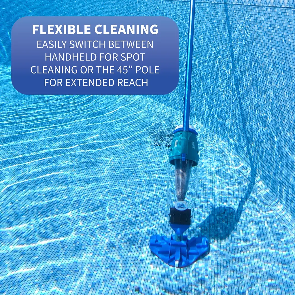 Effortlessly clear debris from your swimming pool or spa with the Pool Blaster® Fusion™ PV-10. This powerful cleaner is powered by a rechargeable lithium battery, offering up to 45 minutes of cleaning time. Easily switch between using the included four-piece pole for extended cleaning or as a handheld vacuum for maintenance tasks. The unit suctions debris into a reusable, easy-to-clean filter bag, ensuring crystal-clear water free from leaves, sand, and other debris in just minutes. Lightweight and cordless, the Pool Blaster® Fusion™ PV-10 is the perfect solution for quick cleaning and maintenance. Comes with a one-year warranty.