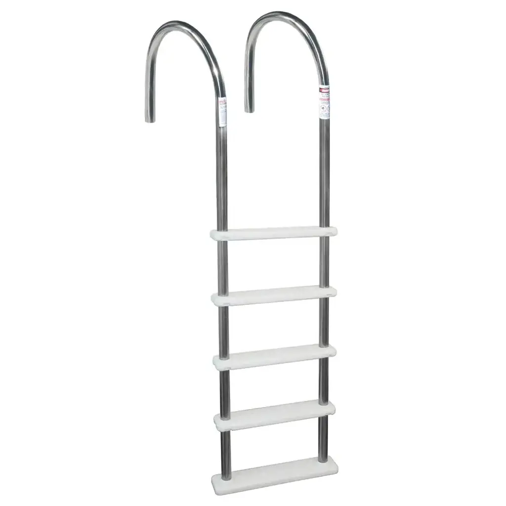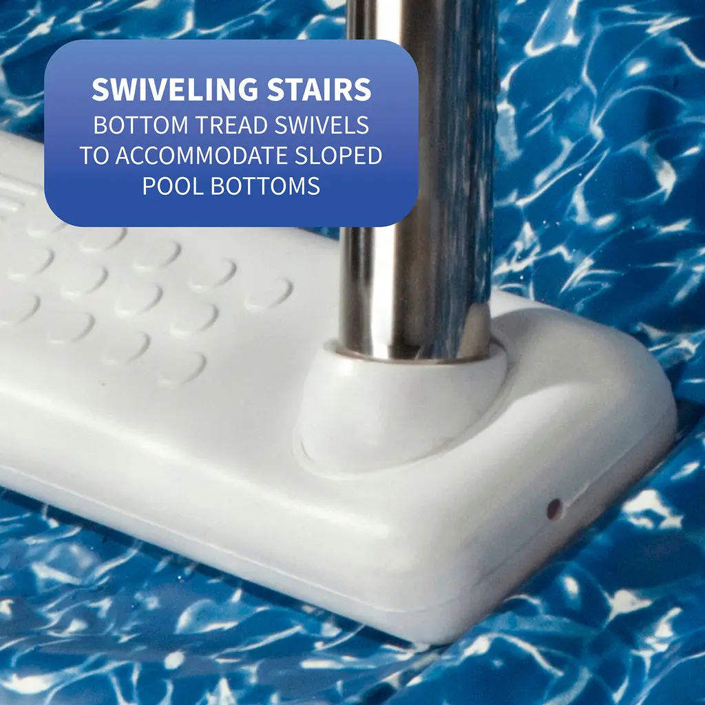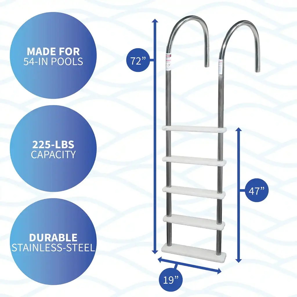This stainless steel in-pool ladder is designed with quality features to make entering and exiting your above-ground pool easier and safer. It fits pools up to 54 inches deep and has heavy-duty stainless-steel rails that support up to 225 pounds. The ladder features extra-deep, resin non-skid steps for secure footing, and its base pivots to accommodate sloped pool bottoms. It includes white plastic flanges and stainless-steel hardware for secure deck mounting. The ladder comes with a 1-year limited warranty. Please note: this ladder is not suitable for use in saltwater pools.