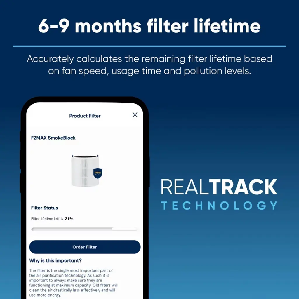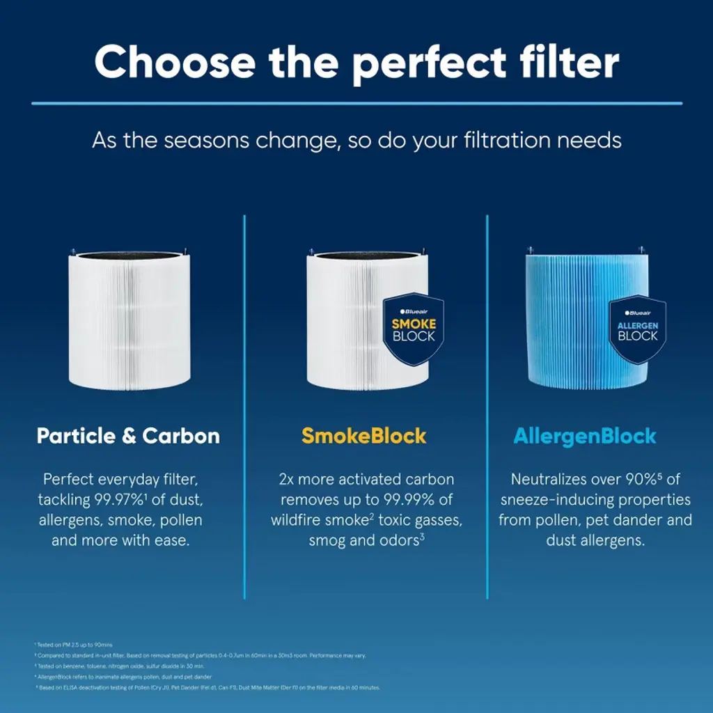 The Blue Pure 211i Max SmokeBlock Replacement Filter is the ultimate tool against wildfire season. Additional activated carbon removes 99.99% of wildfire smoke along with extra protection against other wildfire emissions such as toxic gasses, smog and odors while also eliminating harmful gaseous pollutants such as volatile organic compounds (VOCs). In addition, advanced polypropylene filter media removes particle pollutants down to 0.1 micron in size from your indoor air, such as pollen, dust, and pet dander. Using a 360-degree air intake and up to 4 times the filter surface area vs. the same models with only mechanical filtration (H13 filter), the Blue Pure 211i Max SmokeBlock filter lasts longer, on average 6 months. Subscribe & save up to 10% on auto-delivered filters when replacement is needed; We recommend replacing your filter about every 6 months depending on usage. ULTIMATE TOOL AGAINST WILDFIRE SEASON: 99.99% wildfire smoke removal based on removal testing of particles 0.4-0.7um in 60min in a 30m3 room. Performance may vary. Also tested on benzene, toluene, nitrogen oxide, sulfur dioxide. FILTERS BUILT TO LAST: Blueair models with HEPASilent's mechanical and electrostatic filtration produced higher CADR, lower noise, and had lower energy consumption vs. the same models with only mechanical filtration (H13 filter). *Tested on E.coli, Influenza A (H1N1), A.niger with a minimum reduction rate of 99.9% in 60min