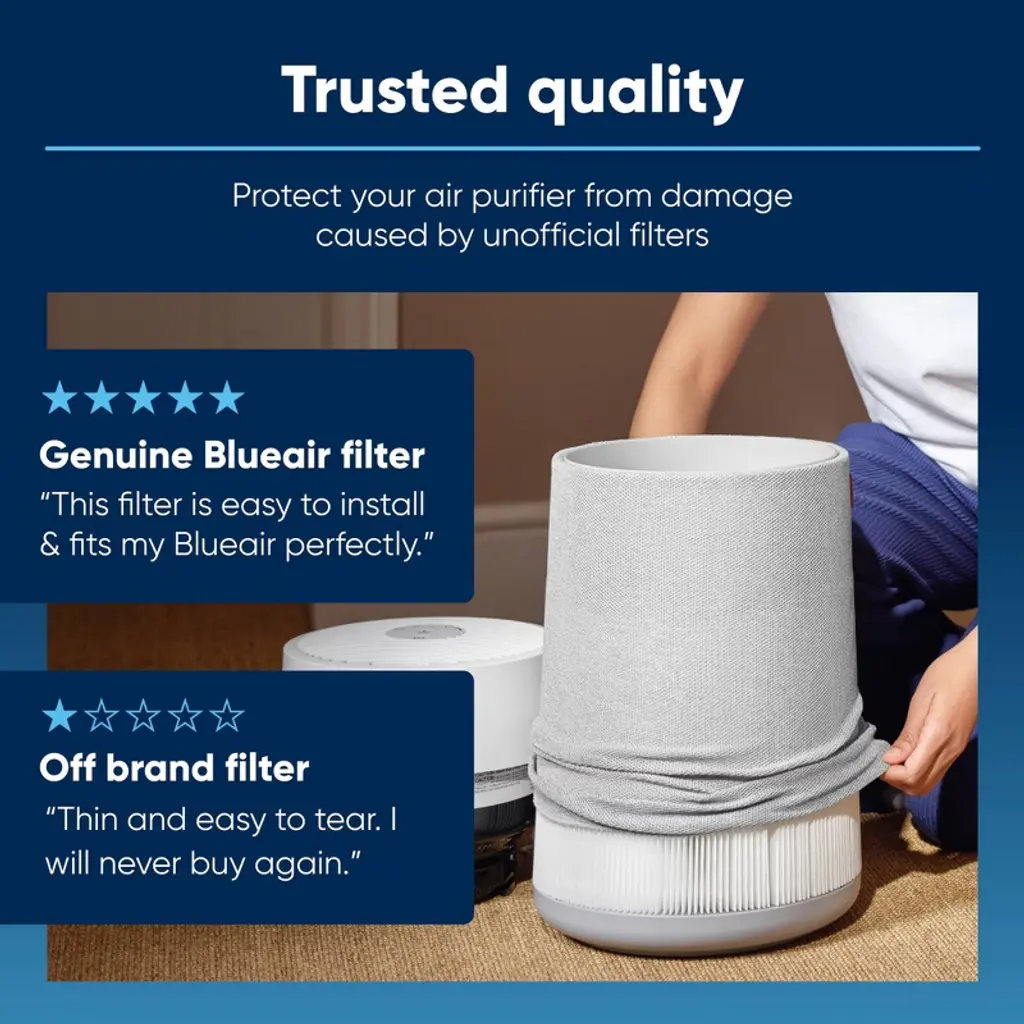 The Blue Pure 311i Max SmokeBlock Replacement Filter is the ultimate tool against wildfire season. Additional activated carbon removes 99.99% of wildfire smoke* along with extra protection against other wildfire emissions such as toxic gasses, smog and odors** while also eliminating harmful gaseous pollutants such as volatile organic compounds (VOCs). In addition, advanced polypropylene filter media removes particle pollutants down to 0.1 micron in size from your indoor air, such as pollen, dust, and pet dander. Using a 360-degree air intake and up to 4 times the filter surface area vs. the same models with only mechanical filtration (H13 filter), the Blue Pure 311i Max SmokeBlock filter lasts longer, on average 6 months. Subscribe & save up to 10% on auto-delivered filters when replacement is needed; We recommend replacing your filter about every 6 months depending on usage. ULTIMATE TOOL AGAINST WILDFIRE SEASON: 99.99% wildfire smoke removal based on removal testing of particles 0.4-0.7um in 60min in a 30m3 room. Performance may vary. Also tested on benzene, toluene, nitrogen oxide, sulfur dioxide. FILTERS BUILT TO LAST: Blueair models with HEPASilent's mechanical and electrostatic filtration produced higher CADR, lower noise, and had lower energy consumption vs. the same models with only mechanical filtration (H13 filter).