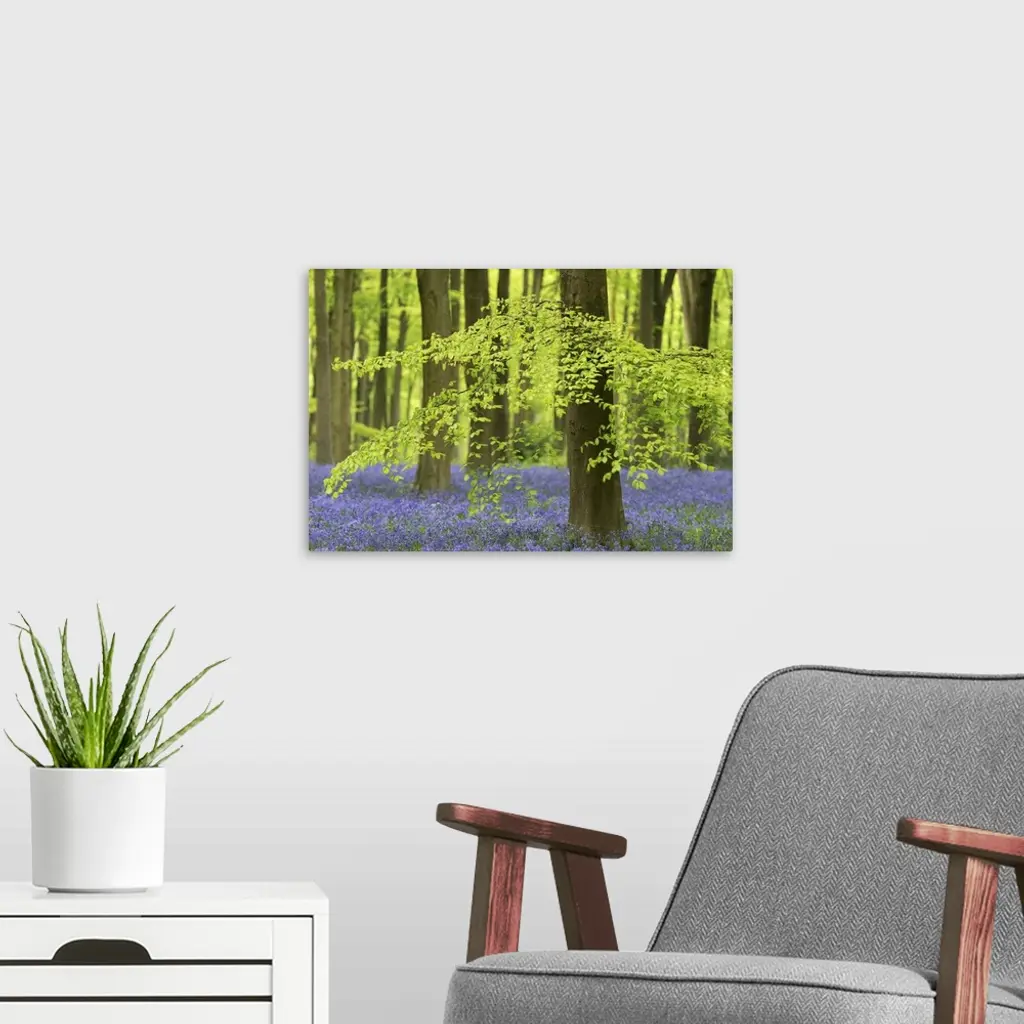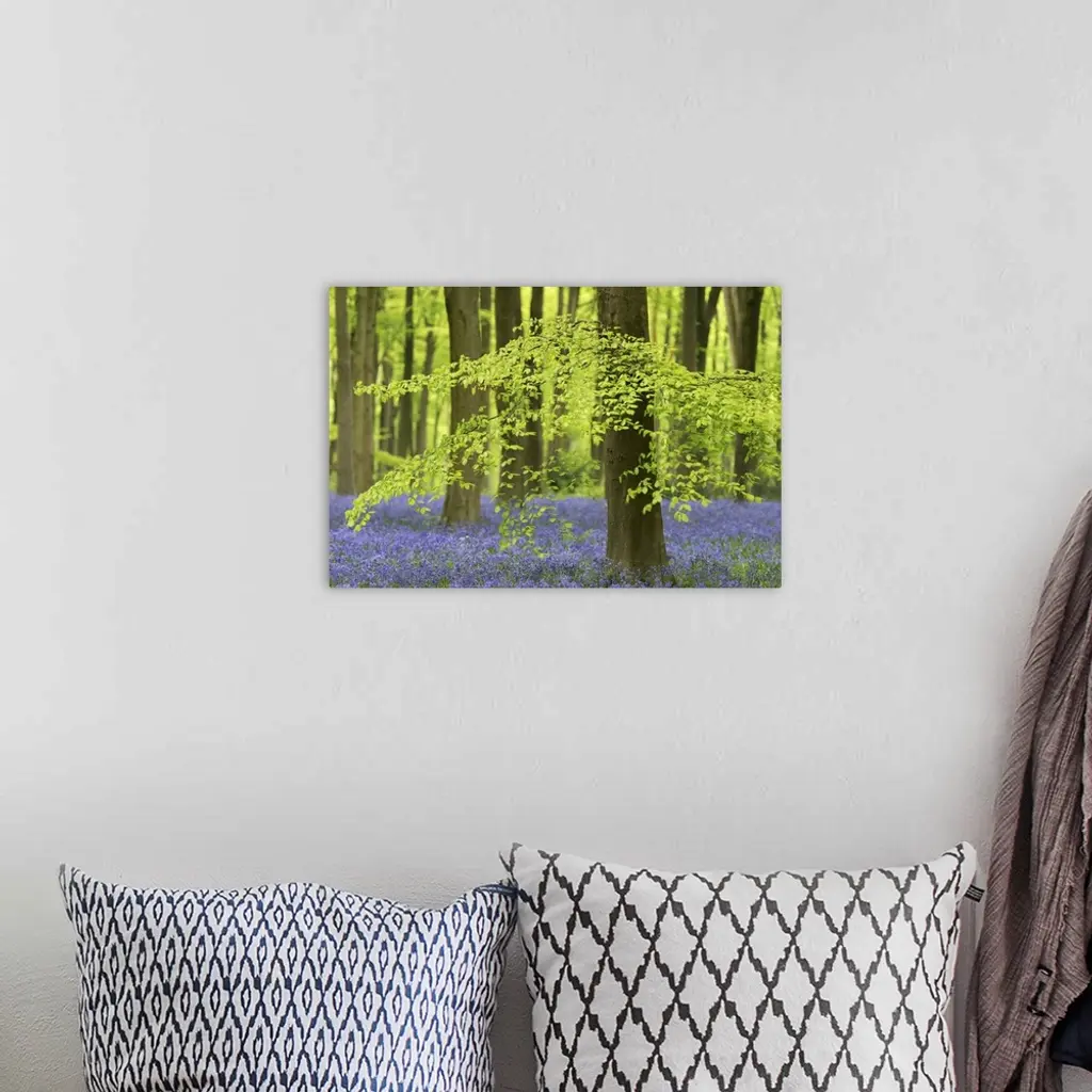 Bluebells and beech trees in West Woods, Wiltshire, England. Spring (May)
