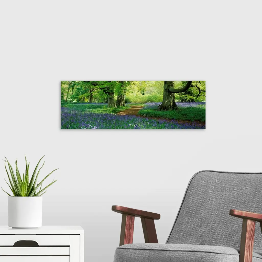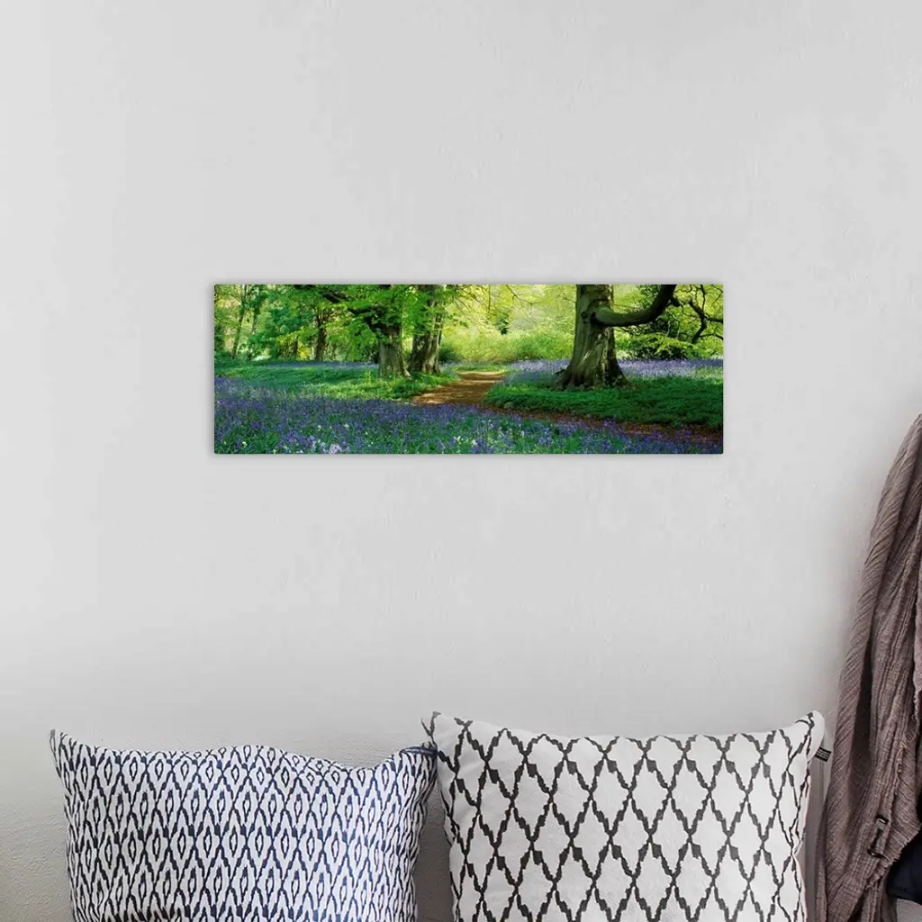 A panoramic photograph of a path through the woods lined with wildflowers.