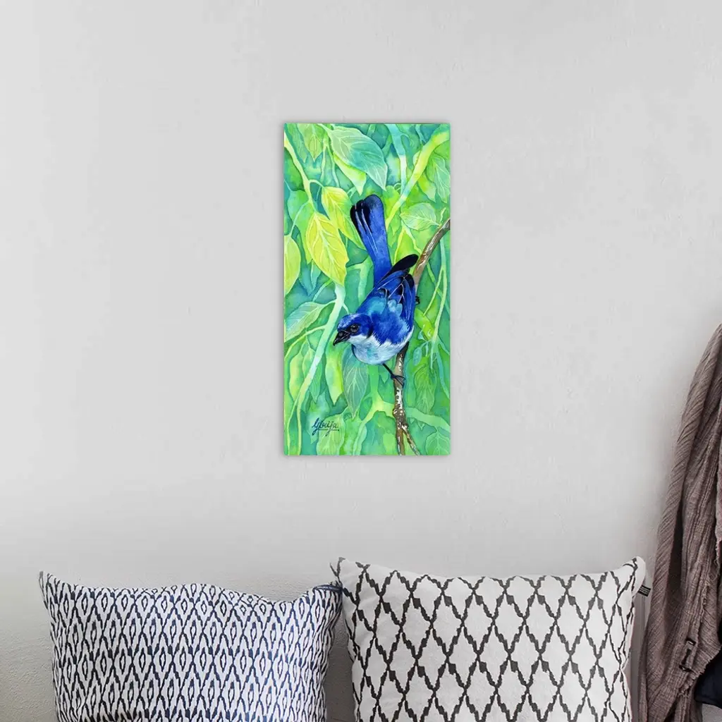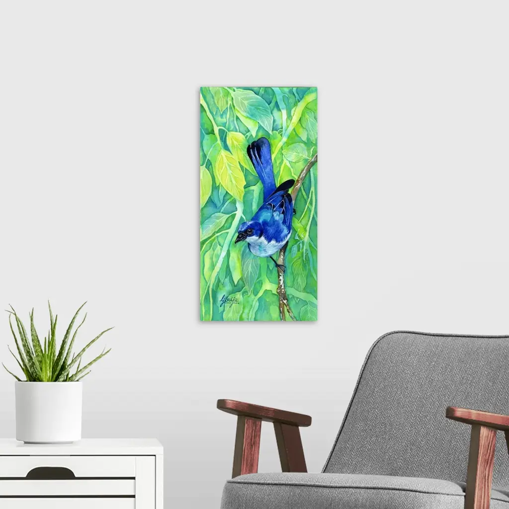 This beautiful blue bird is painted in watercolor on paper with bright yellow green background of leaves.