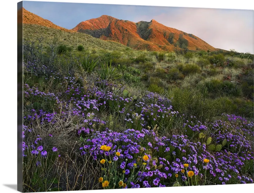 A large decorative piece of wildflowers in a field with cactus intertwined.
