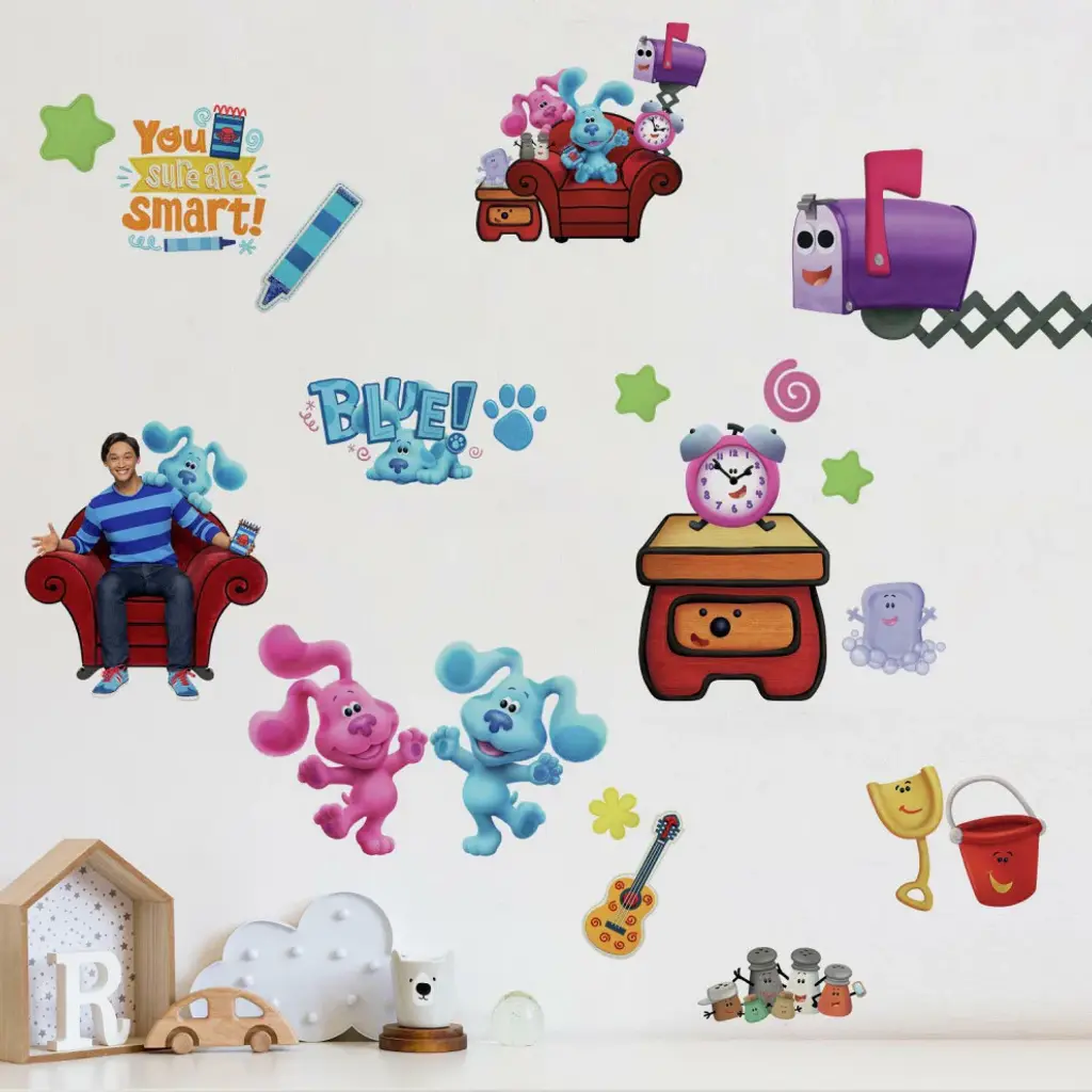 Play along with Blue and her friends with this peel and stick wall decal set inspired by the Nickelodeon show Blue''s Clues & You! Decal(s) sizes - 1.61 inches x 1.64 inches to 12.46 inches x 8.07 inches; Easy to apply - just peel and stick; Applies to any smooth, clean, flat surface; product may not adhere to unclean, textured, recently painted, or nonstick surfaces; Removable and repositionable with no sticky residue left behind; Printed on a safe, high quality material that is free of harmful chemicals like phthalates and lead; Reuse from one space to the next; Perfect for both renters and homeowners; ; .