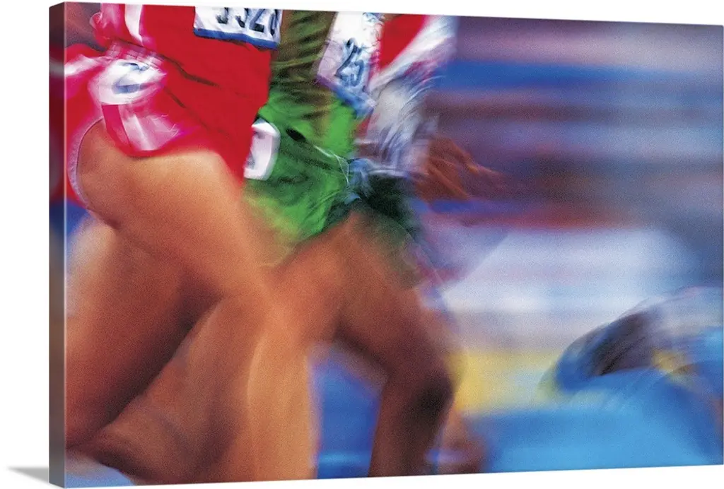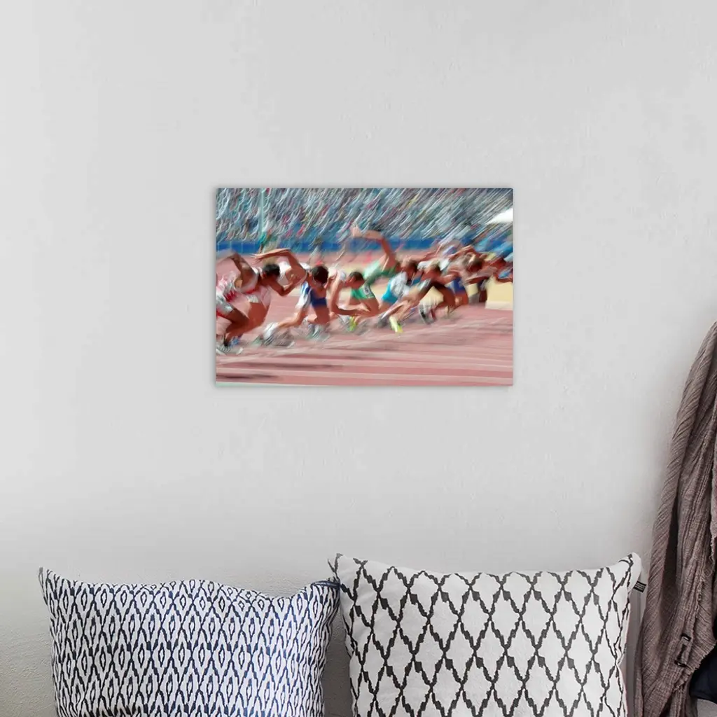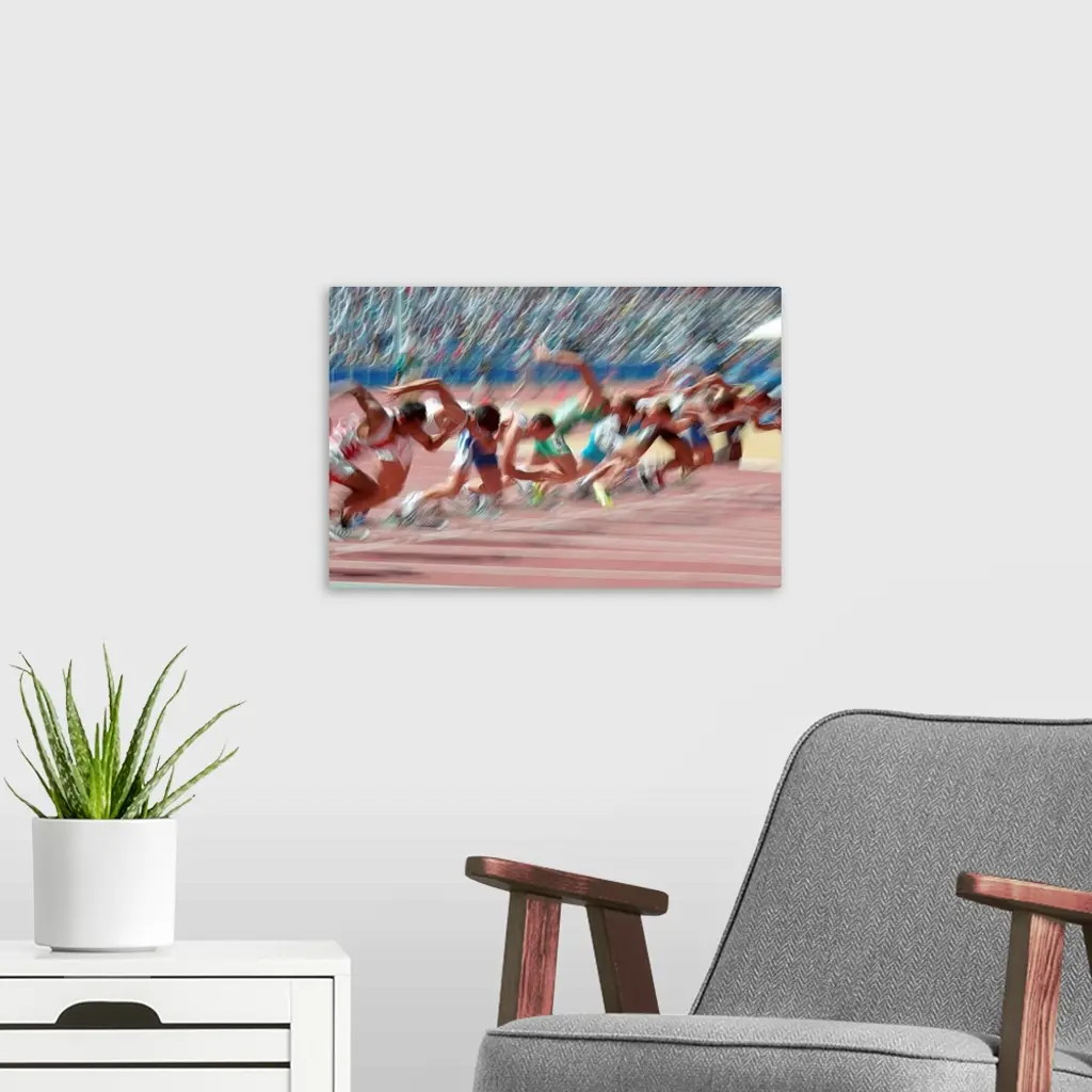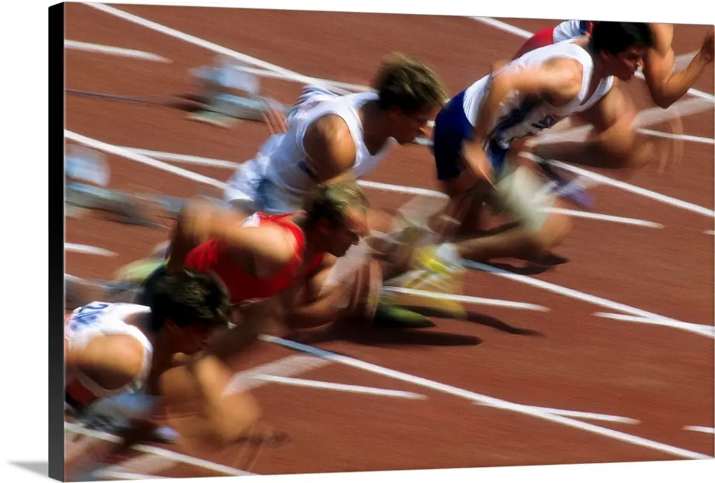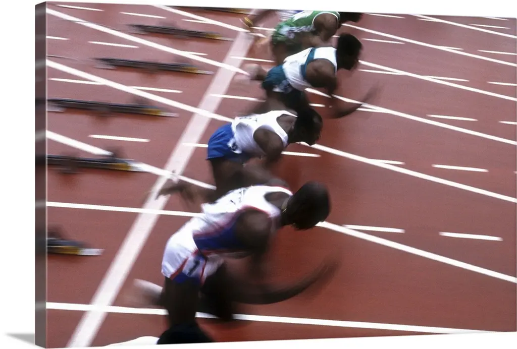 Blurred Action At The Start Of A Mens 100 Meter Track And Field Race