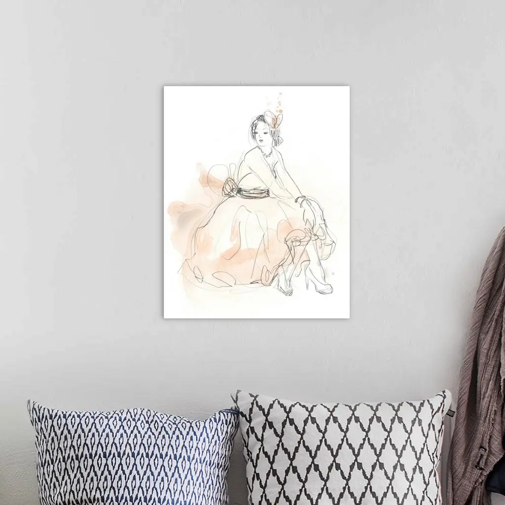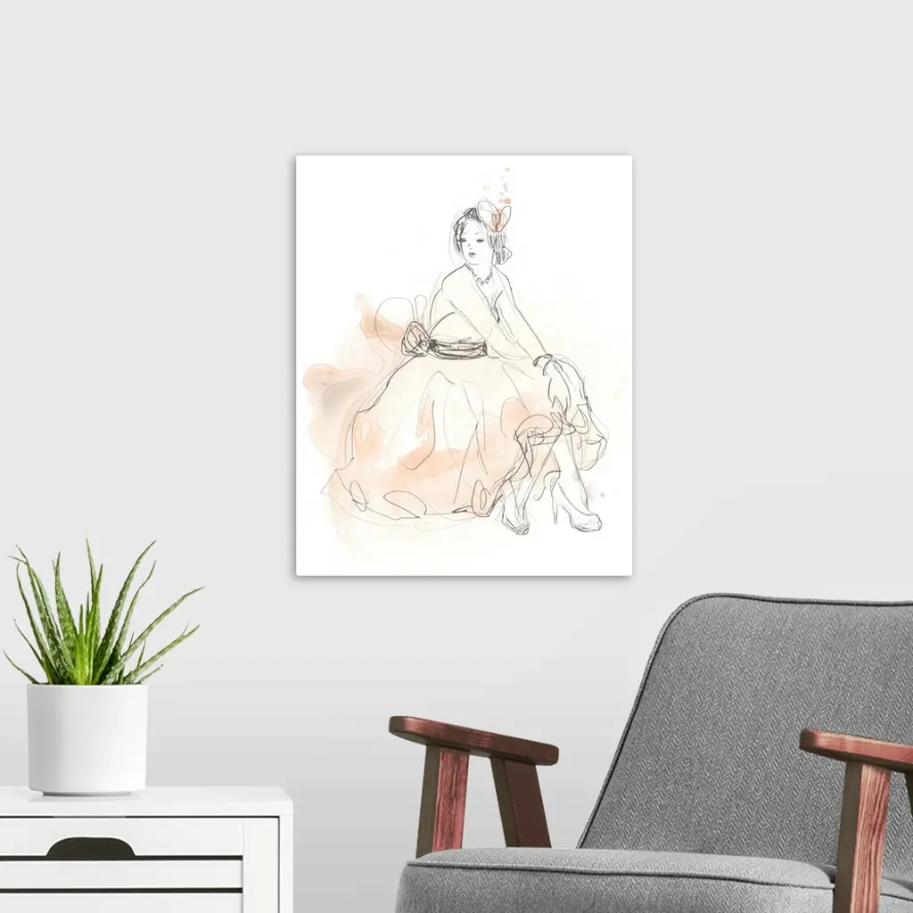 Artistic drawing of a fashionable woman in a dress with light watercolor accents in blush.