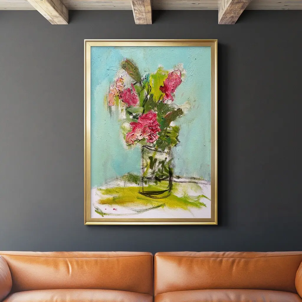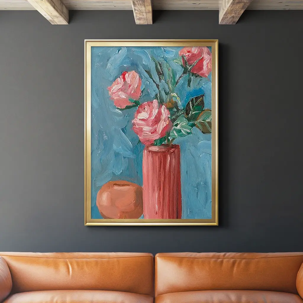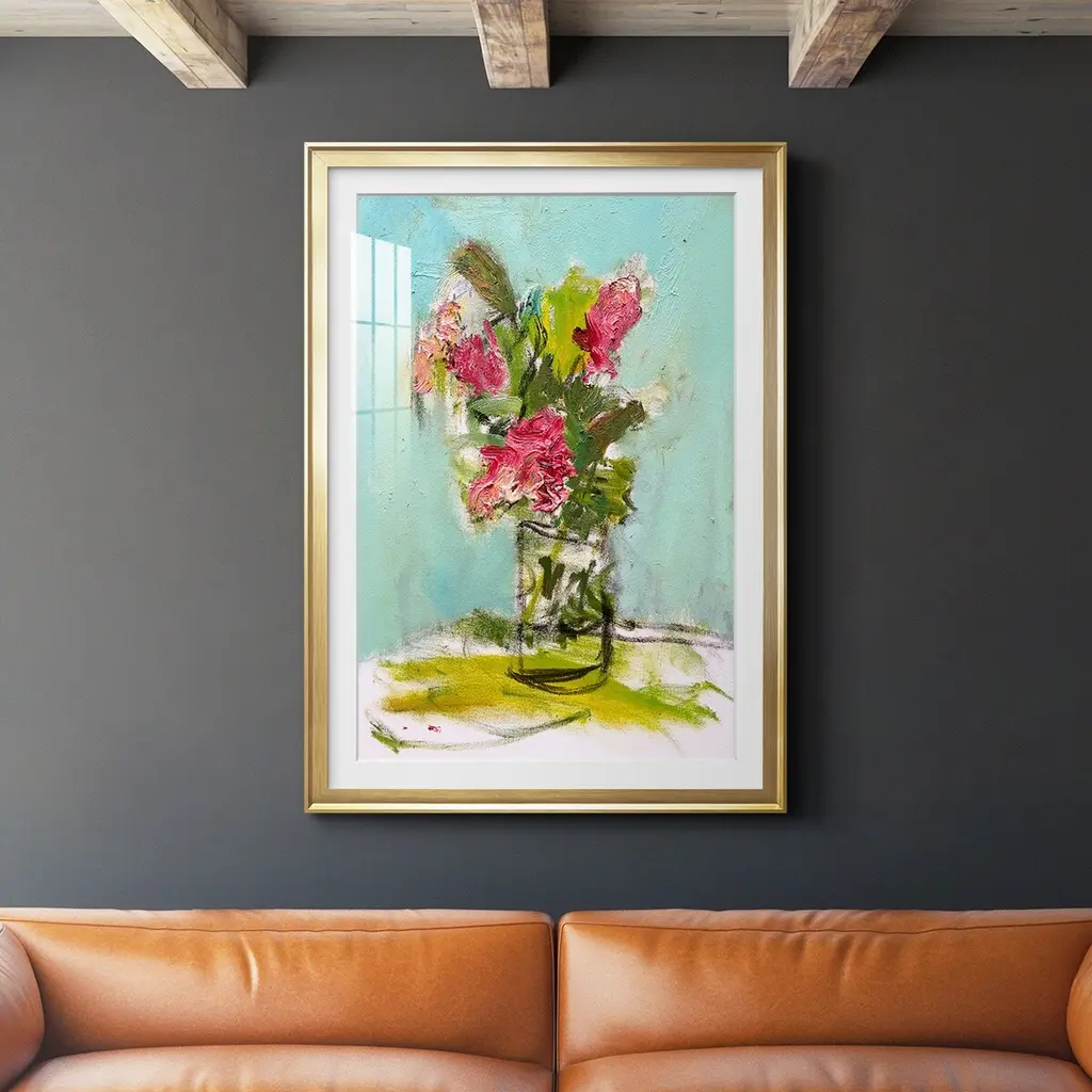 Blush Bloom's simple composition is complemented with distinct, yet well-blended color. Uneven texture brings the scene life while its small scale is the perfect fit for built-in shelves, or kitchen and bathroom counters.