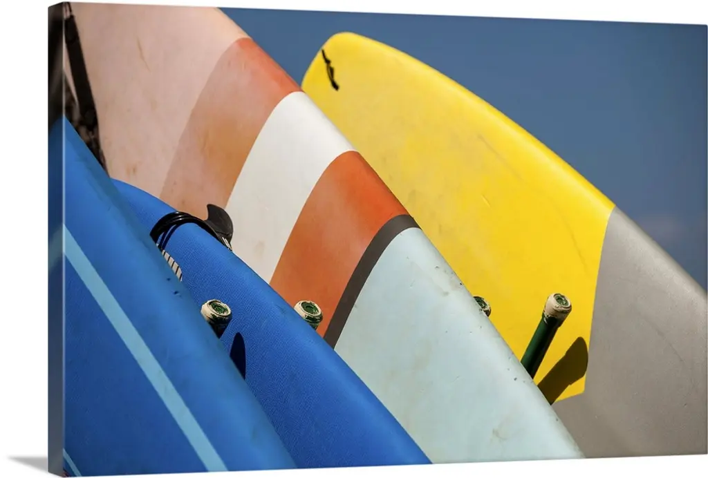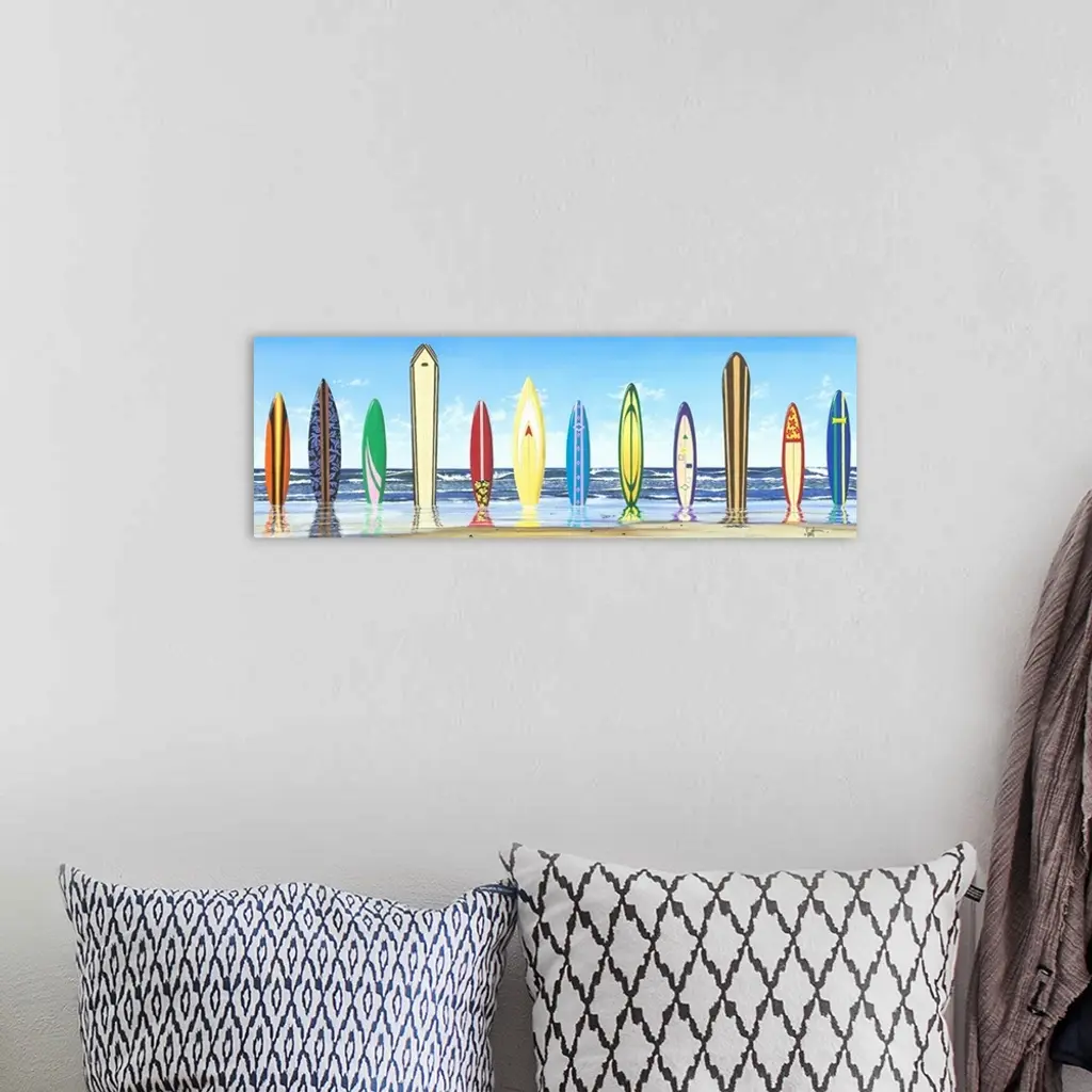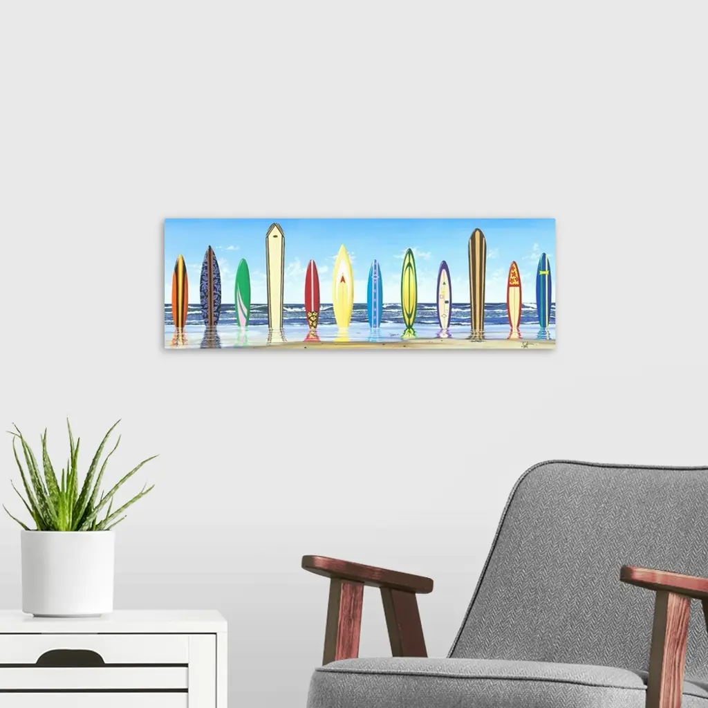 Panoramic photograph of color surfboards standing in sand with the ocean in the background.