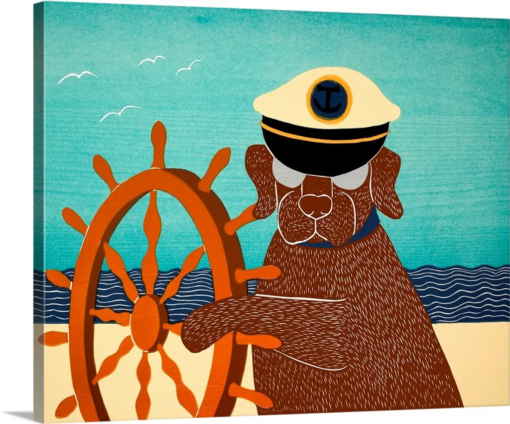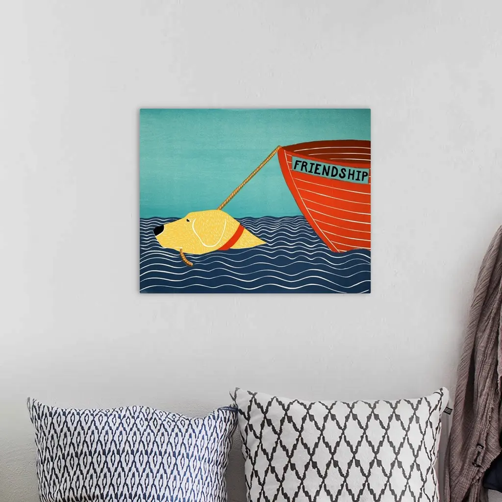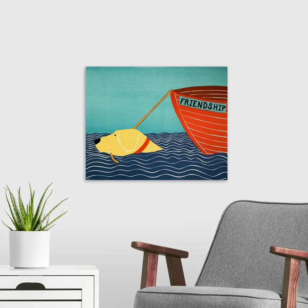 Illustration of a yellow lab swimming the the ocean pulling a red boat called "Friendship" behind him.
