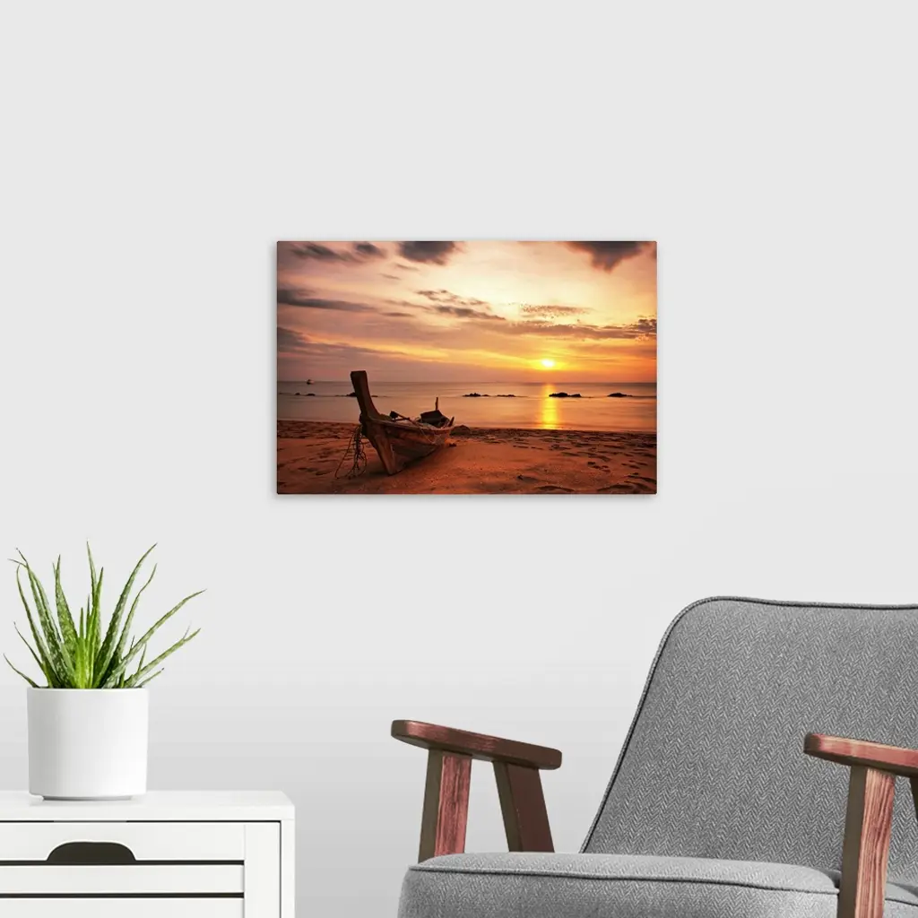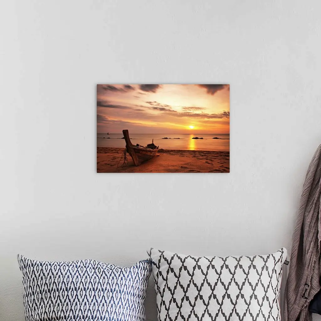 Boat On Beach At Sunset On Koh Lanta, Thailand.