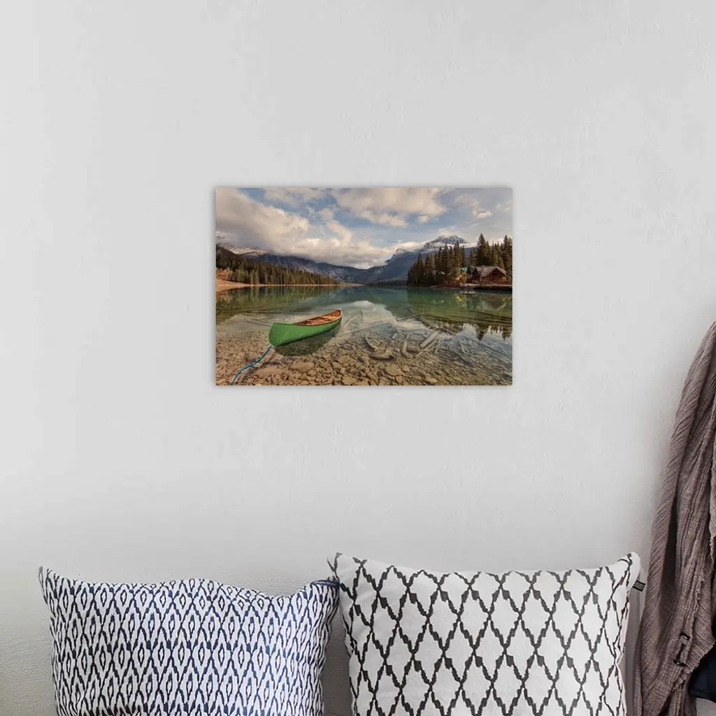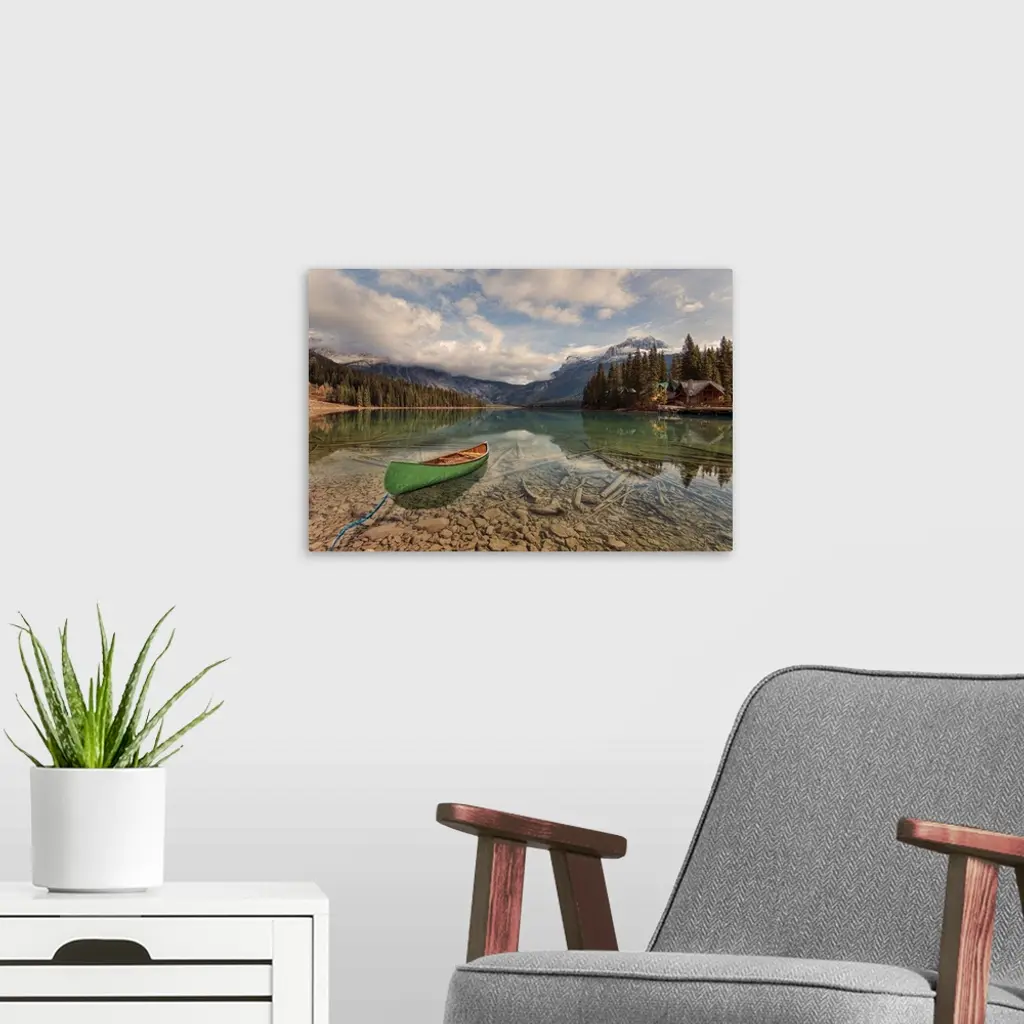 Boat on emerald lake in Yoho national park, British Columbia, Canada. It is the largest of Yoho's 61 lakes and ponds, as well as one of the park's premier tourist attractions.