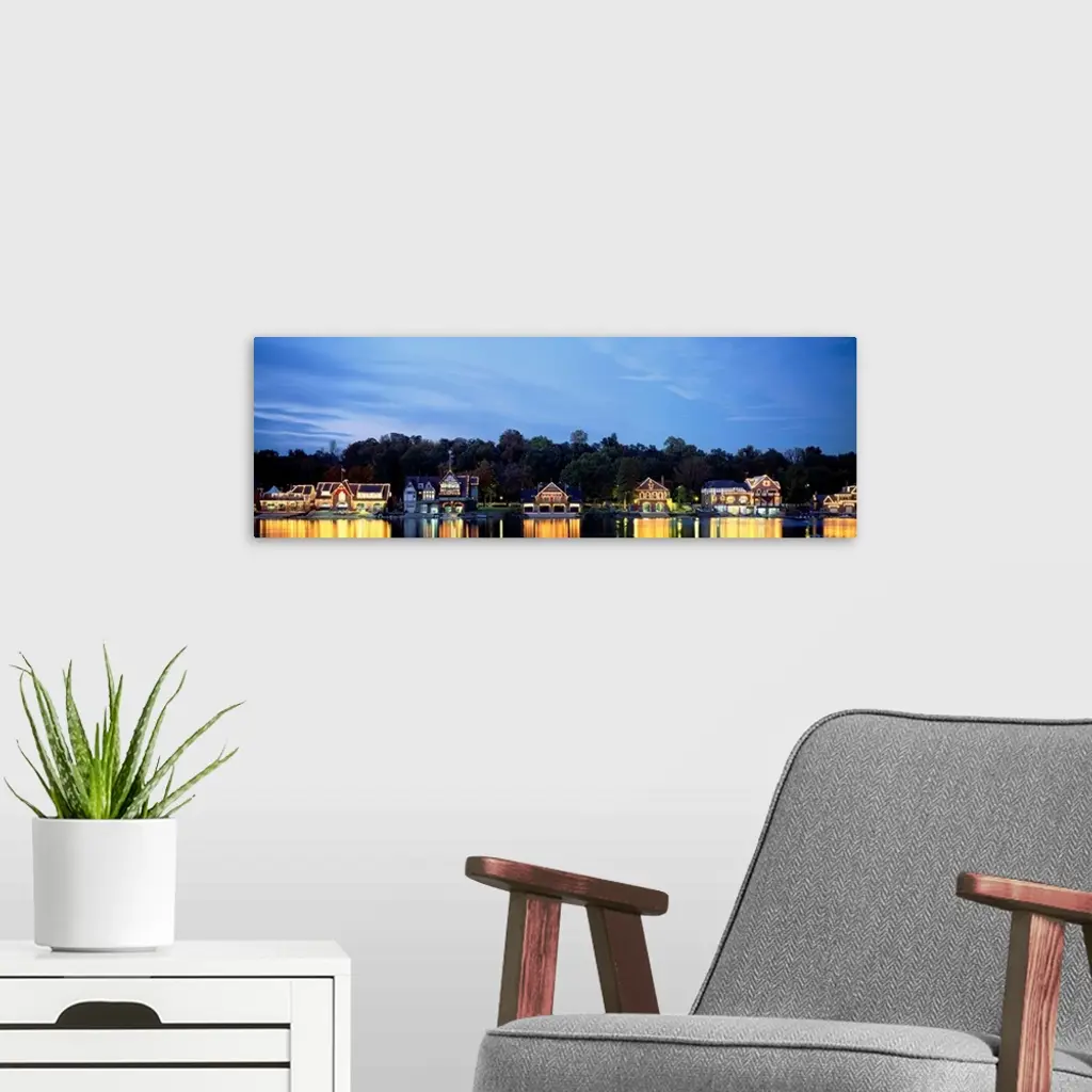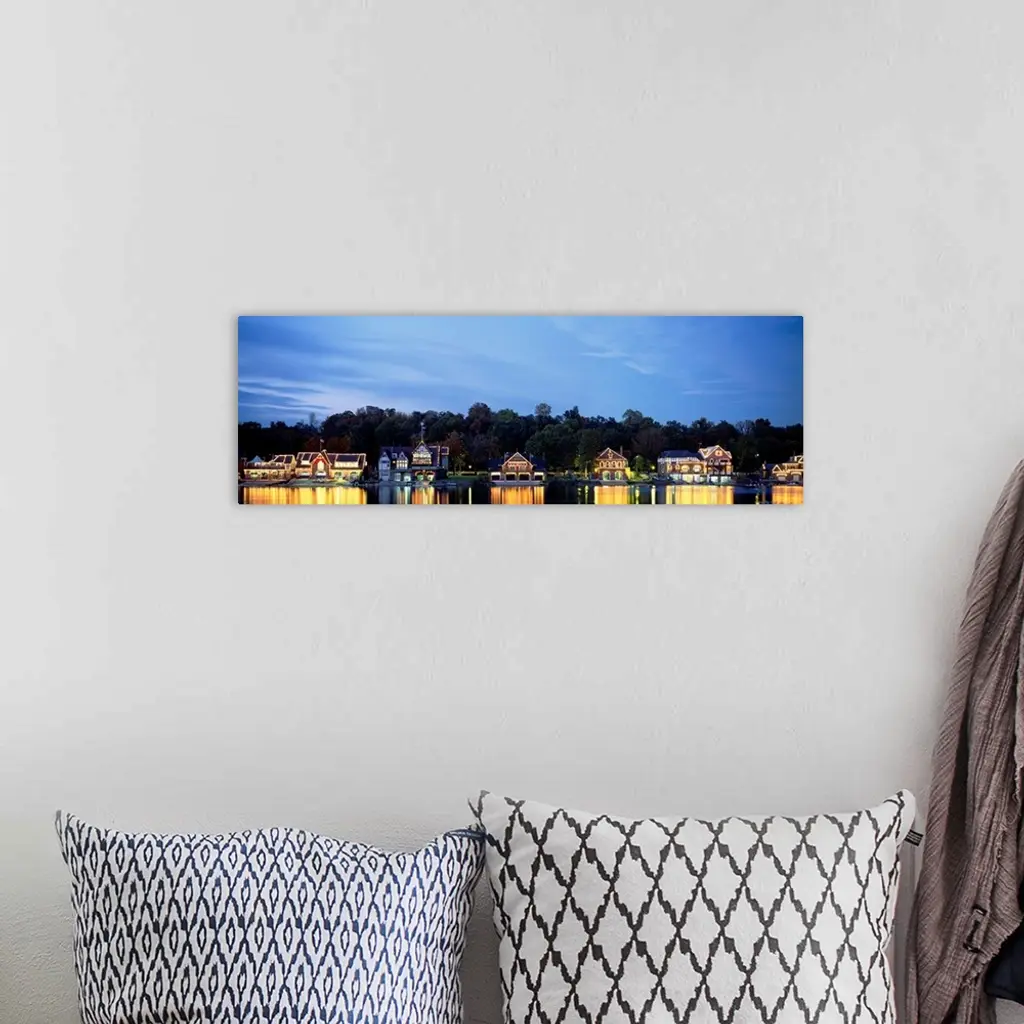Panoramic photograph taken of Boathouse Row in Philadelphia at night with a backdrop full of trees. The bright lights of the houses can be seen reflecting over the water in the foreground.