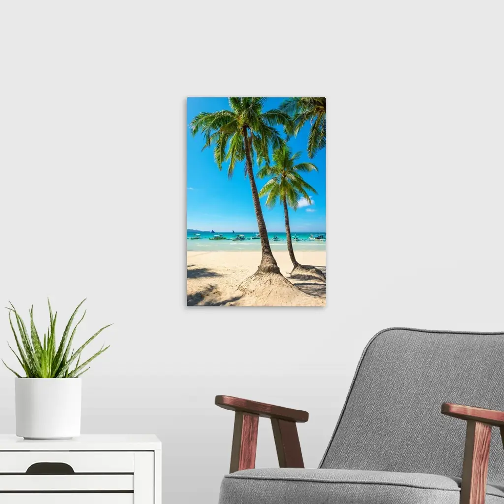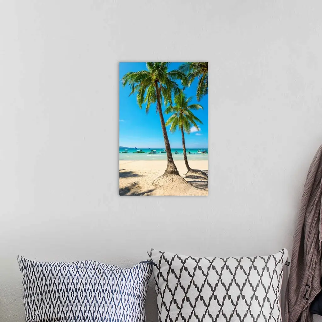 Boats And Palm Trees On White Beach, Boracay Island, Western Visayas, Philippines