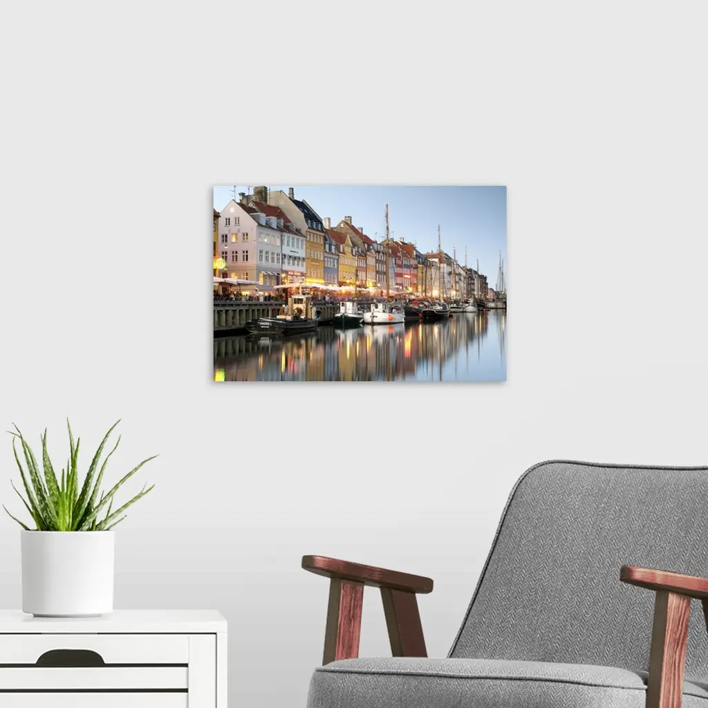 Boats and townhouses along the Nyhavn canal in Copenhagen.