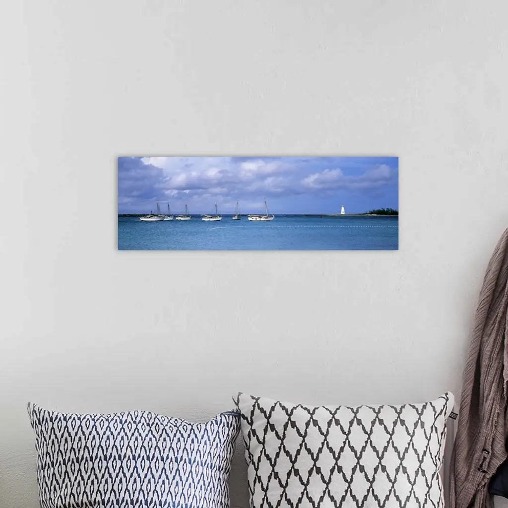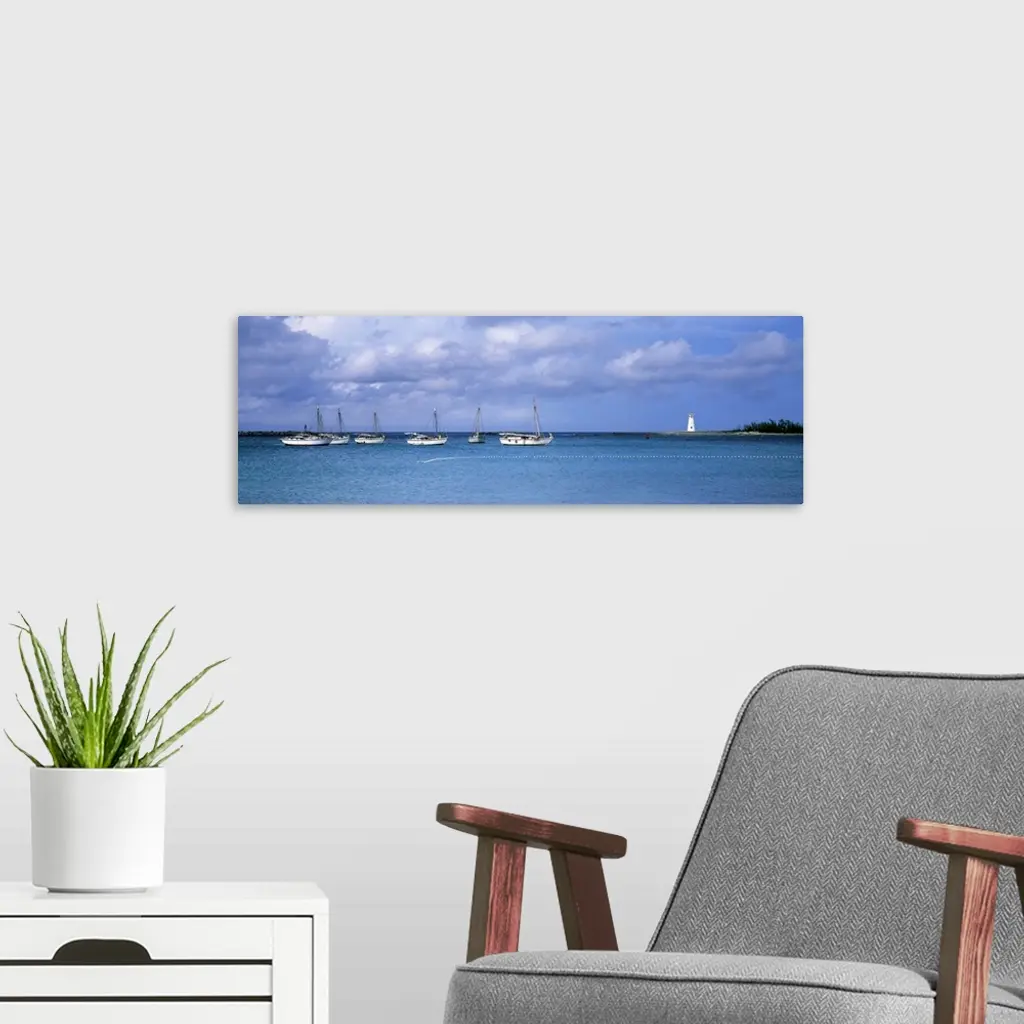 Boats in the sea with a lighthouse in the background, Nassau Harbour Lighthouse, Nassau, Bahamas wall art for home and office decor. Discover canvas art prints, photos, mural, big canvas art and framed wall art in GreatBigCanvas.com's varied collections.