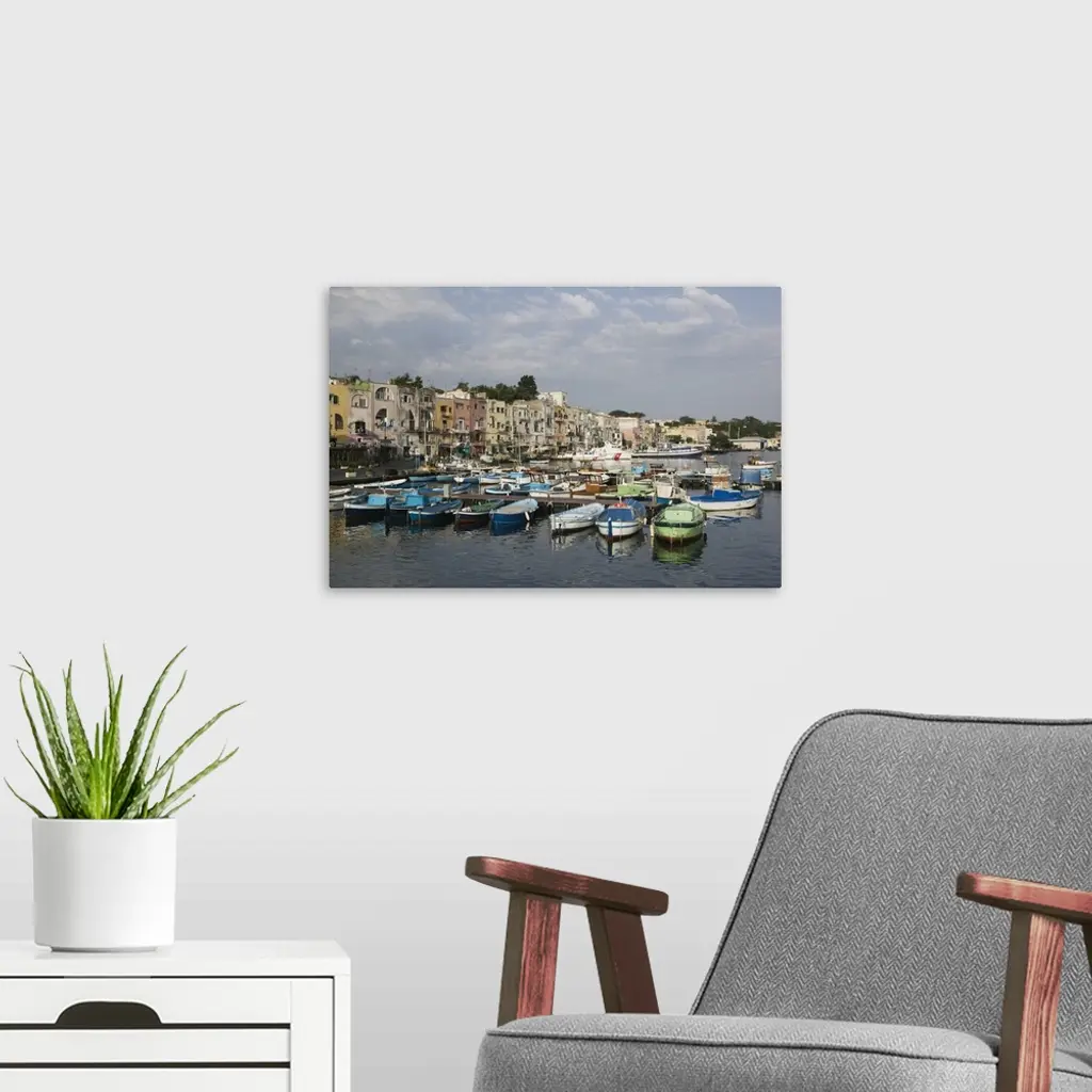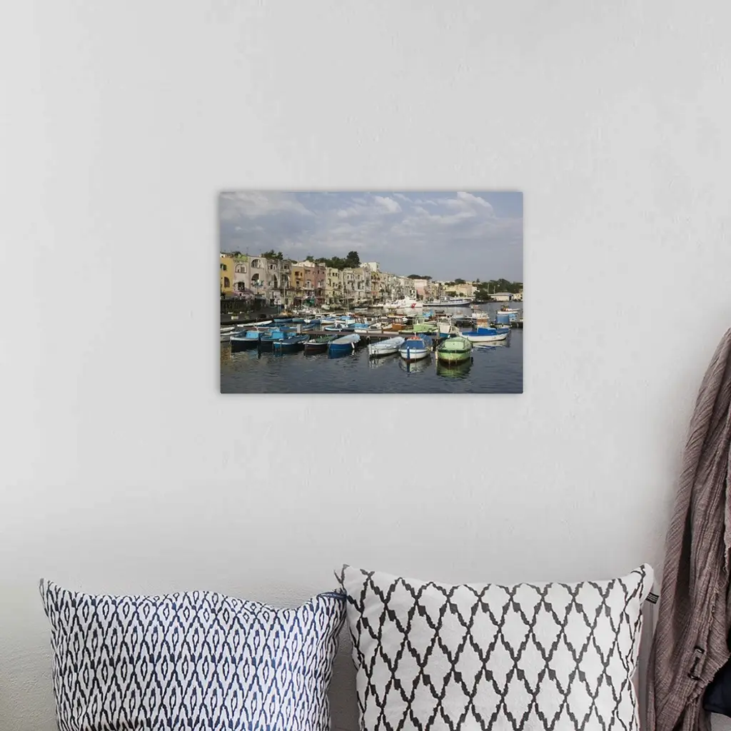 Boats moored at a port, Procida, Naples, Campania, Italy wall art for home and office decor. Discover canvas art prints, photos, mural, big canvas art and framed wall art in GreatBigCanvas.com's varied collections.