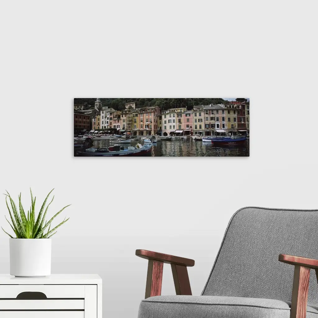 Panoramic photograph on a big canvas of a many boats anchored in the Italian Riviera harbor, a line of tall, colorful buildings along the shore in the background, in Portofino, Italy.