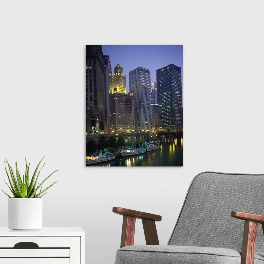 Portrait photograph on a big wall hanging of lit skyscrapers towering over the edge of the Chicago River, where several boats are anchored, city lights are reflecting in the water, in Chicago, Illinois.