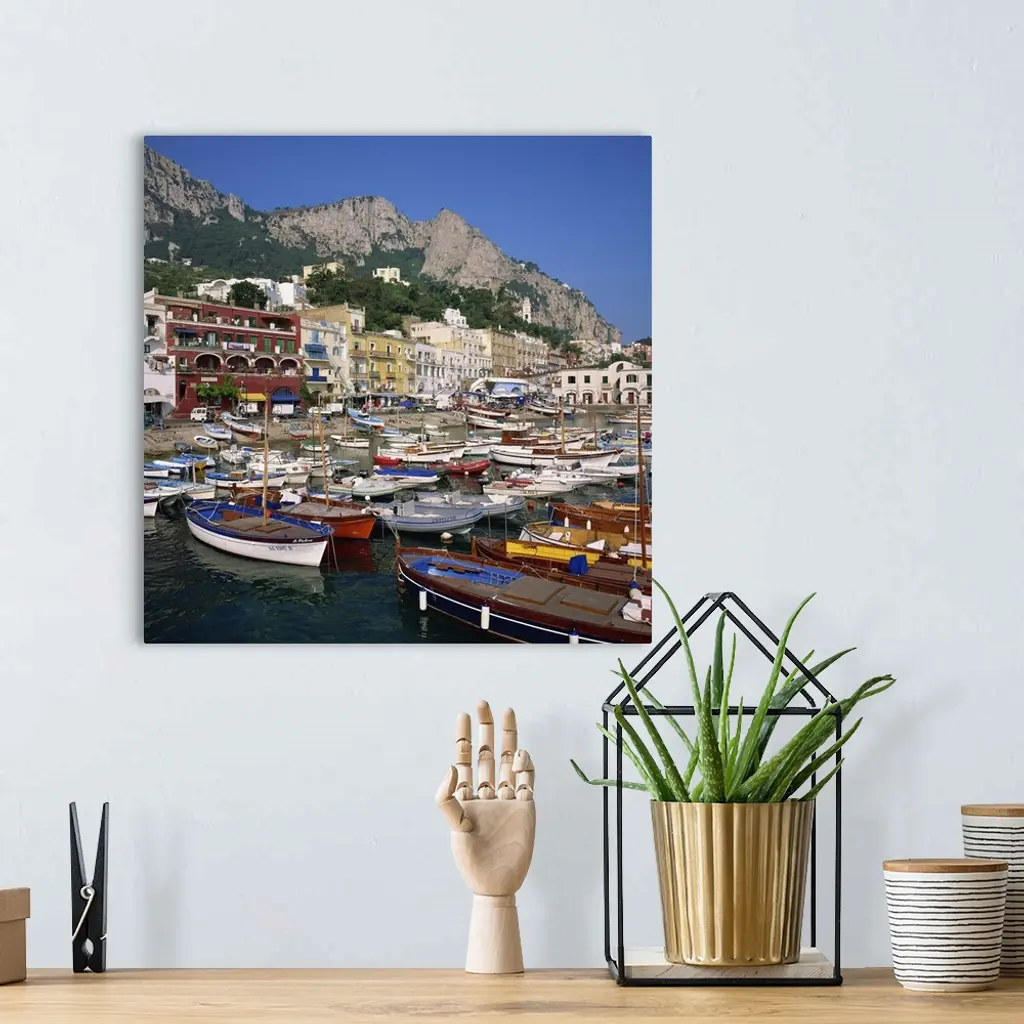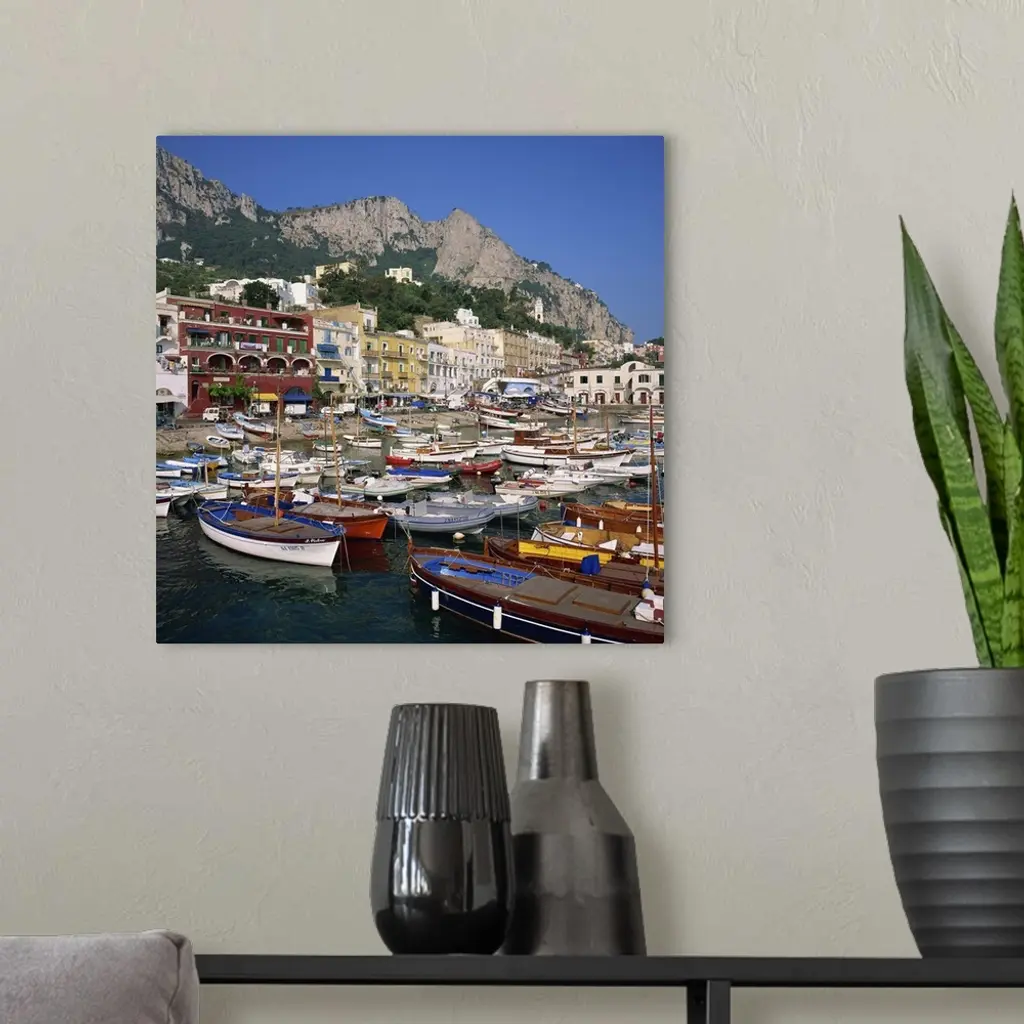Boats moored in the Marina Grande, Capri, Campania, Italy, Europe wall art for home and office decor. Discover canvas art prints, photos, mural, big canvas art and framed wall art in GreatBigCanvas.com's varied collections.
