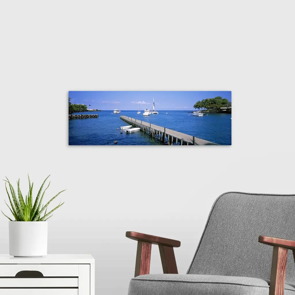 Boats near a pier in a bay, Keauhou Bay, Kailua Kona, Hawaii wall art for home and office decor. Discover canvas art prints, photos, mural, big canvas art and framed wall art in GreatBigCanvas.com's varied collections.
