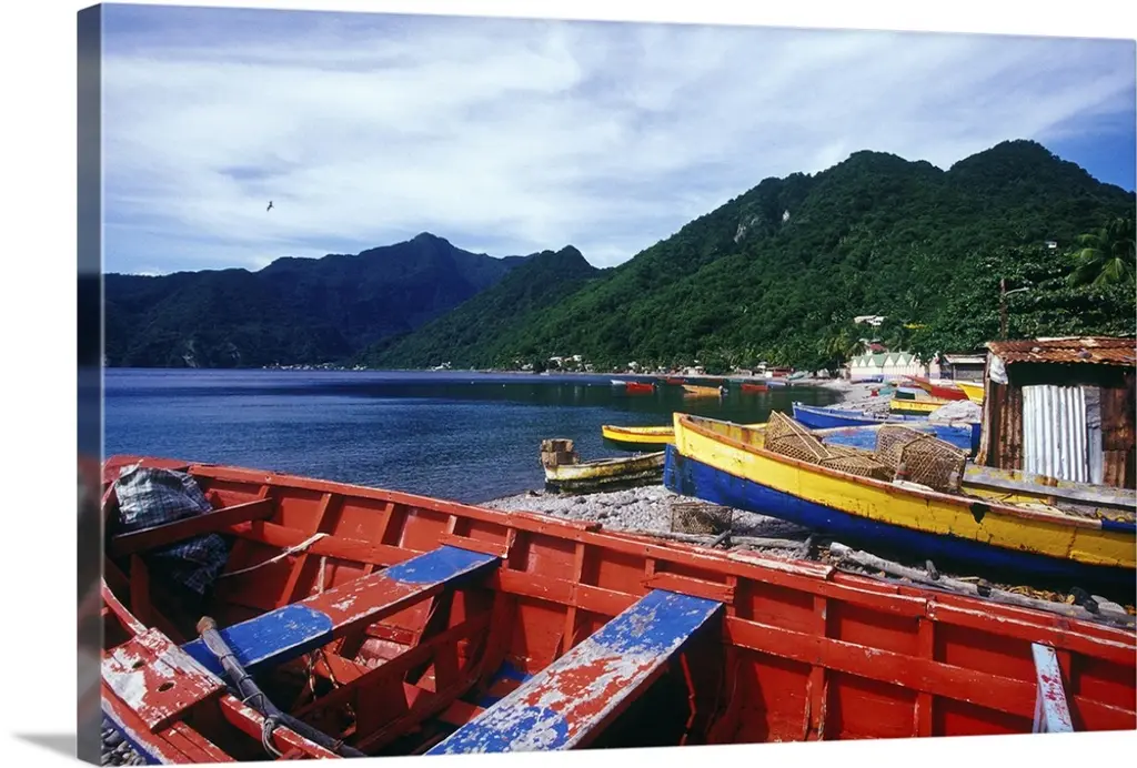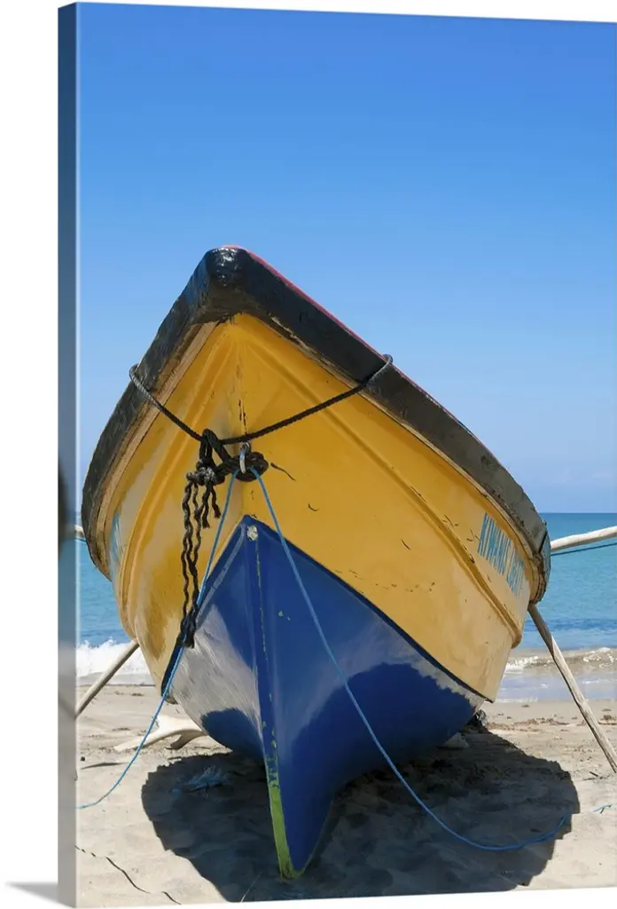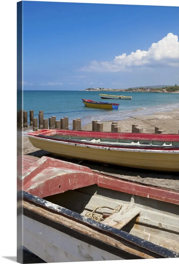 A photograph of colorful boats sitting on the shore of a tropical beach.