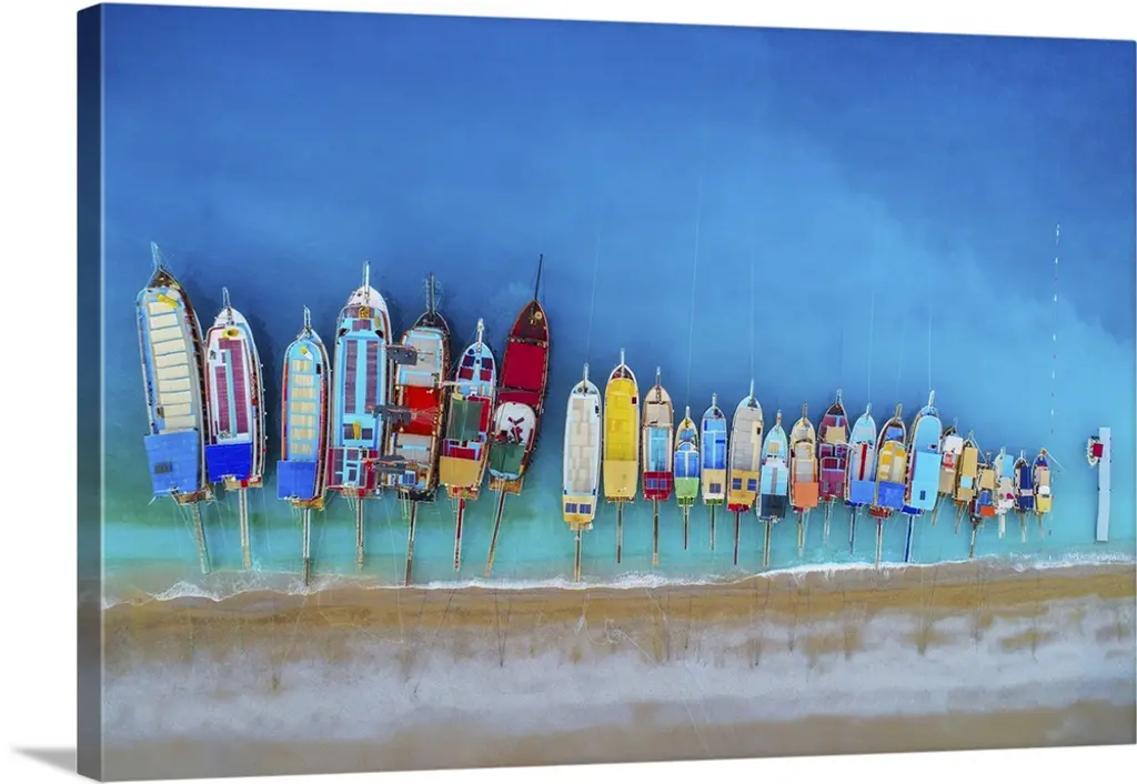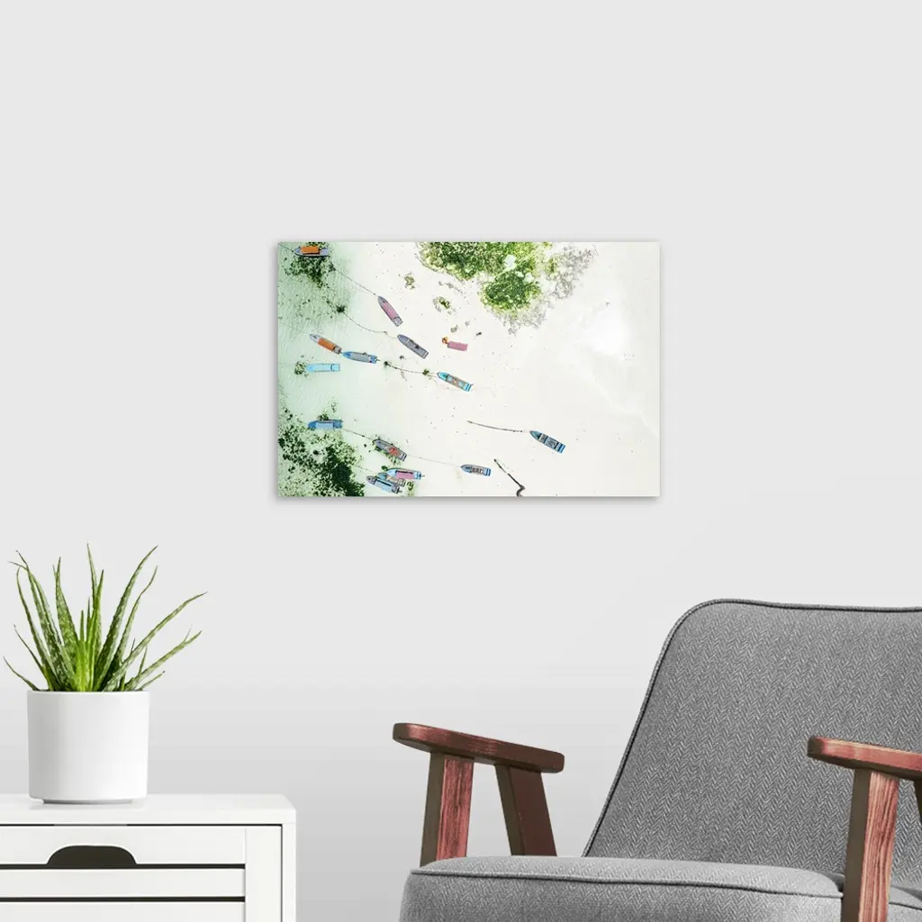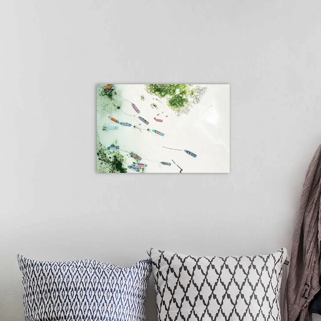 Boats On Idyllic White Coral Beach, Overhead View, Zanzibar, Tanzania, Africa