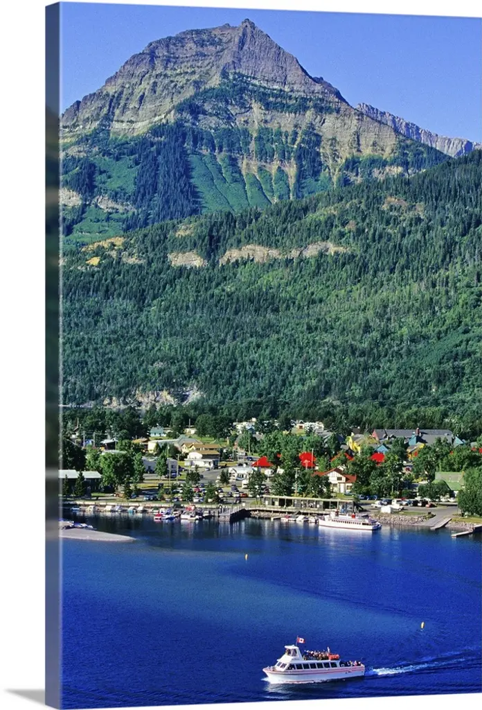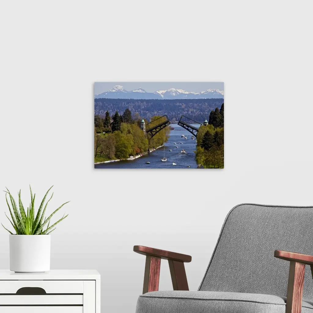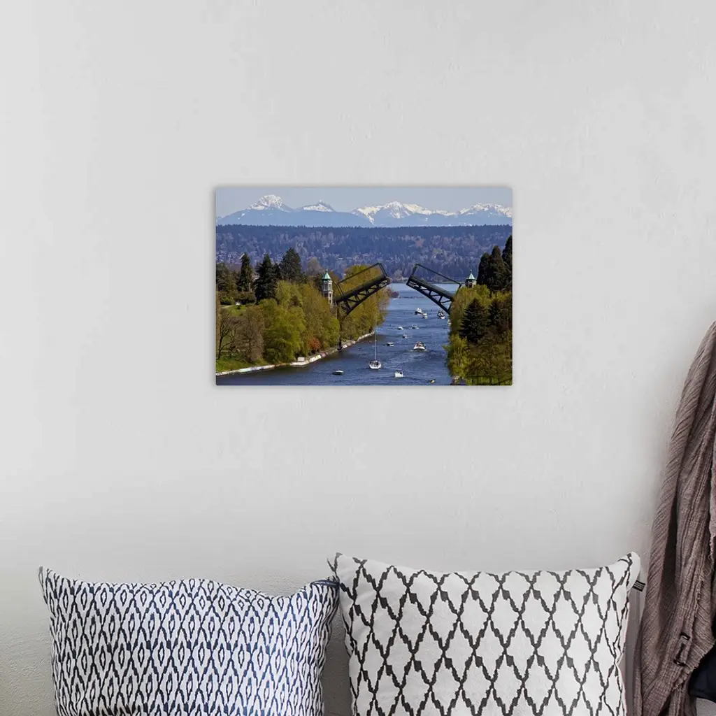 Landscape photograph on a large wall hanging of Montlake drawbridge, raised as boats pass under it, between Lake Washington and Lake Union. The bridge is surrounded by large, green trees, and a vast landscape and snow capped mountains can be seen in the background, in Washington.