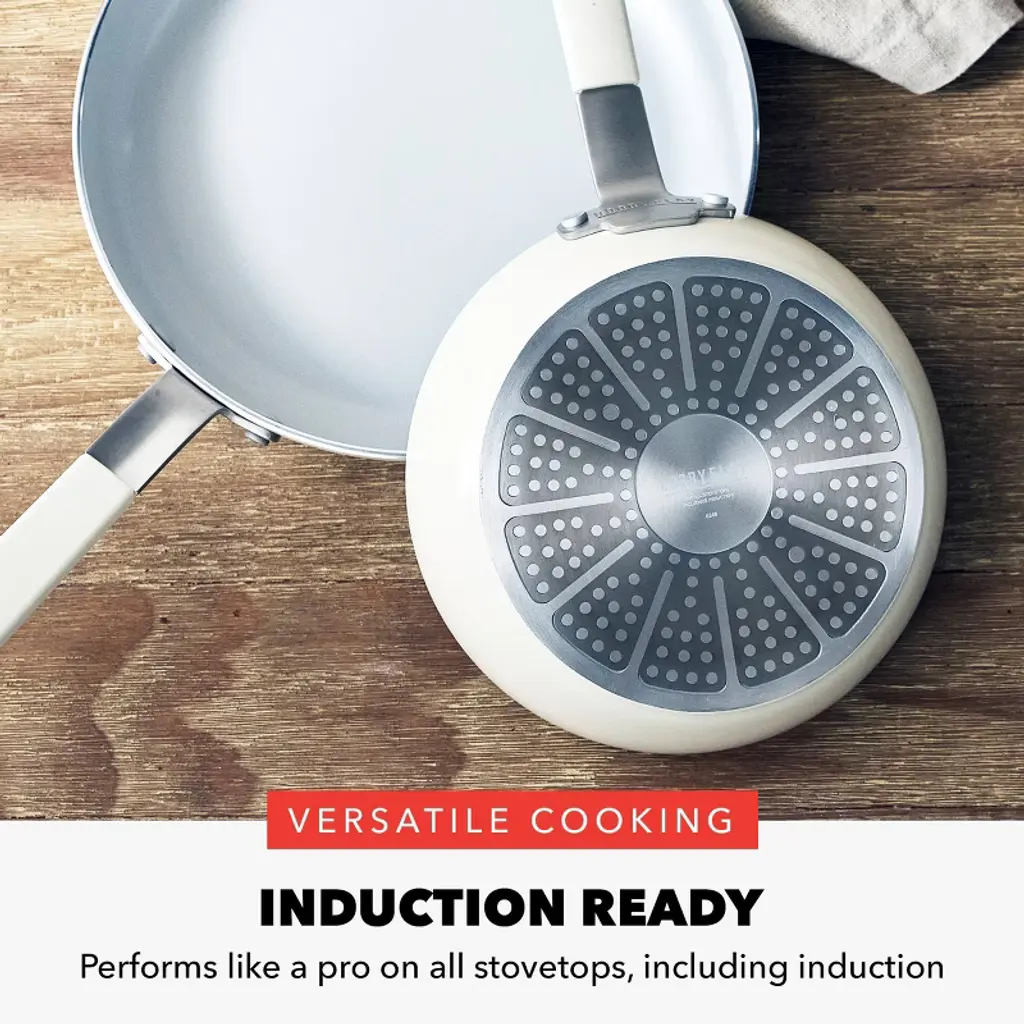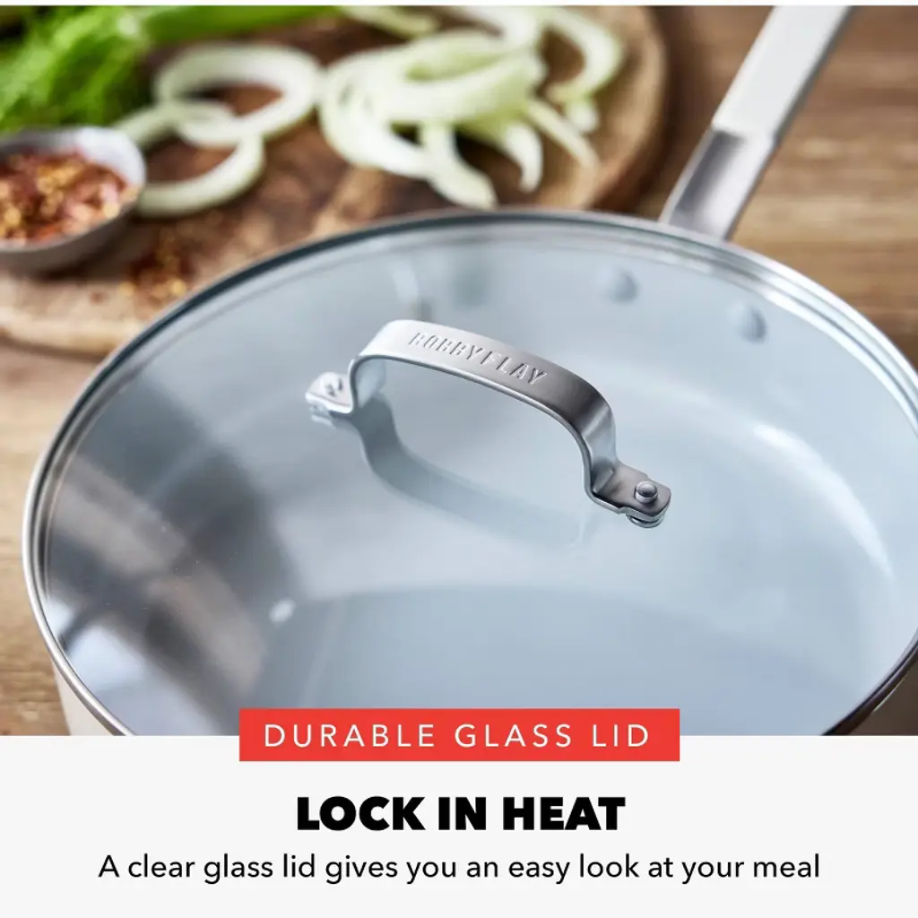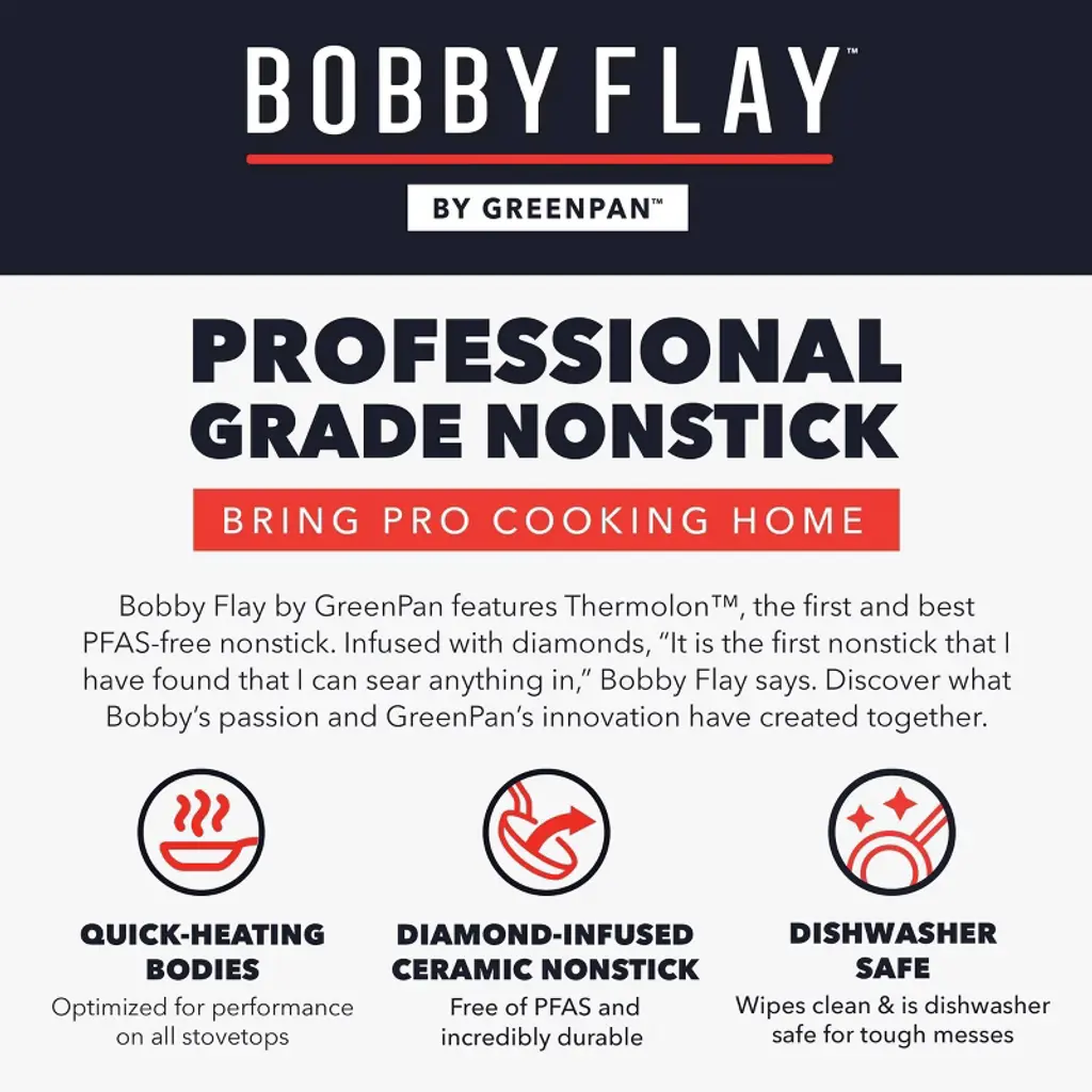 World-renowned chef, TV host, restaurateur, and author Bobby Flay partnered with GreenPan to bring years of expertise and cooking innovation to this cutting-edge collection. Crafted from quick-heating aluminum, this pan lets you dial in the right temp so you can master your meals. This frypan set features GreenPan’s signature diamond-infused ceramic nonstick coating to deliver years of powerful PFAS-free performance. frying pan is packed with helpful details and GreenPan’s groundbreaking cooking technology. The generous chef handle stays cool to keep cooking comfortable so you can focus on flavor. Plus, the chip-free edges help prevent chips and dings to the coating for long-lasting performance and added durability. Designed to deliver in any kitchen, these pans are optimized for performance on all stovetops, including induction. They are also oven safe up to 400˚F and dishwasher safe for effortless cleanup.