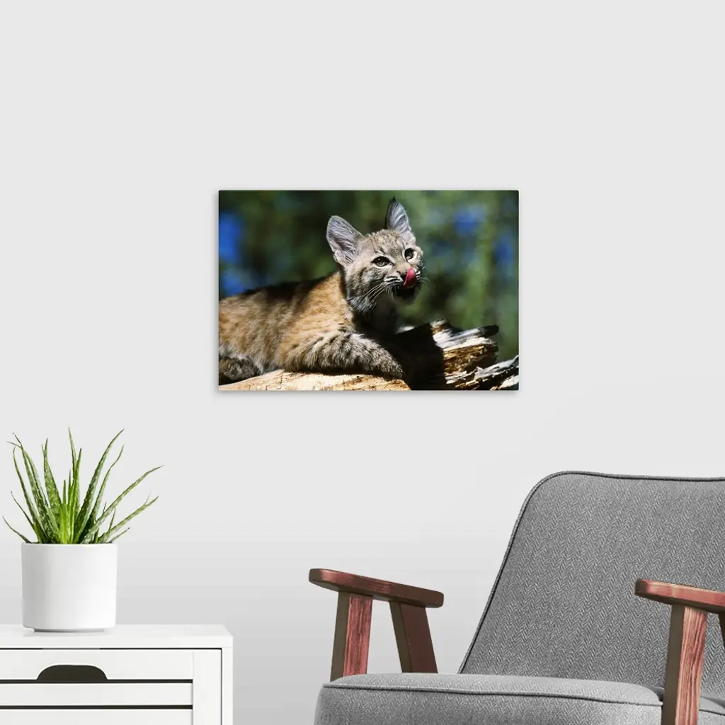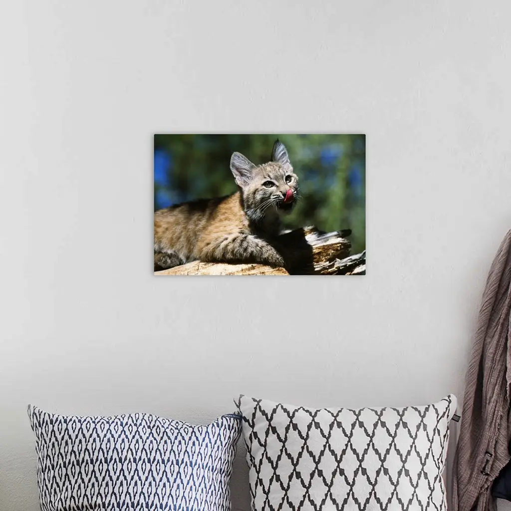 Bobcat Kitten Licking Nose wall art for home and office decor. Discover canvas art prints, photos, mural, big canvas art and framed wall art in GreatBigCanvas.com's varied collections.