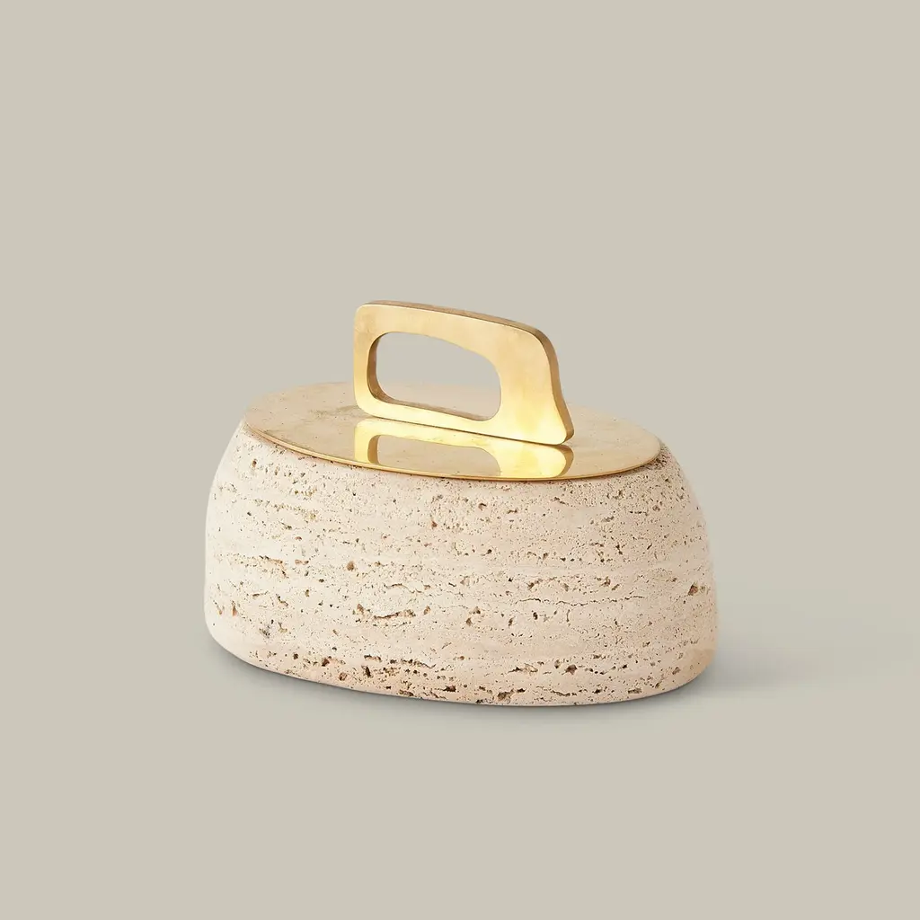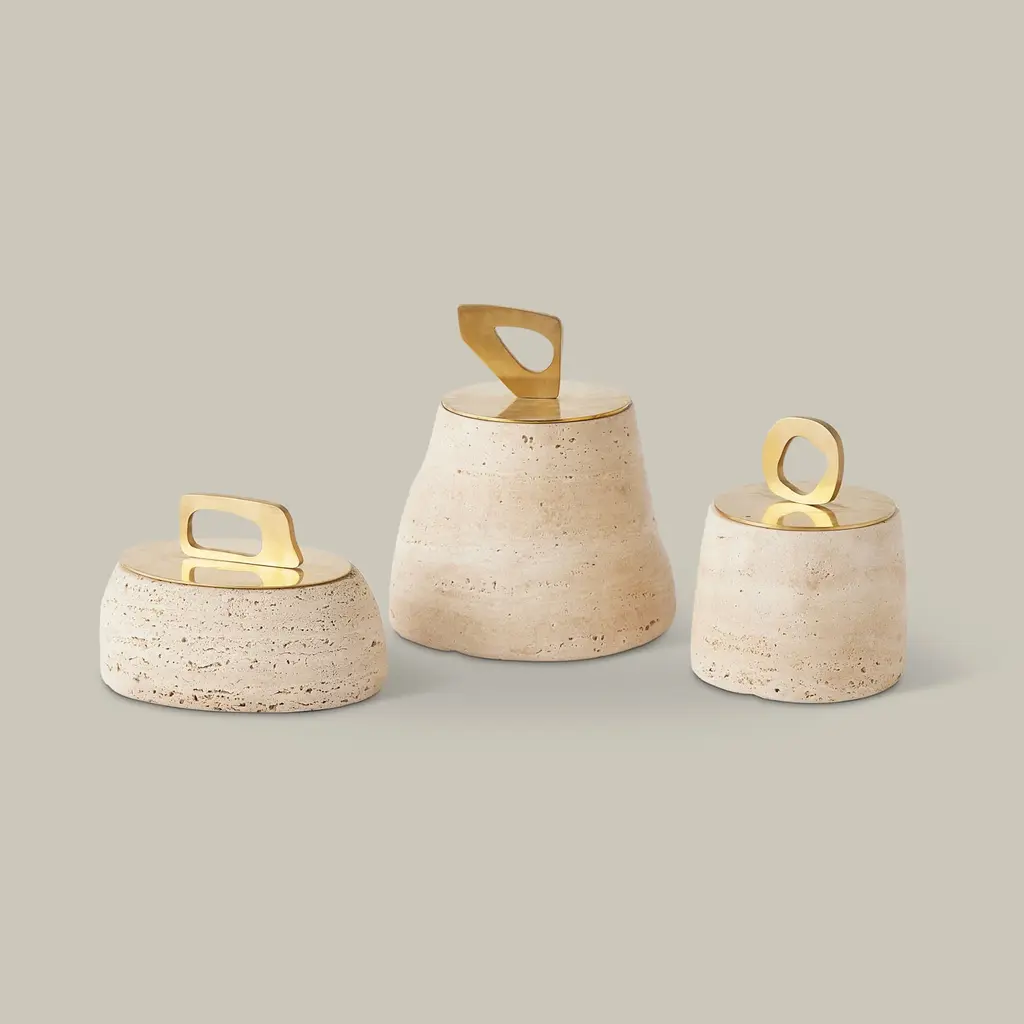 The Bocal Lidded Pot Collection by Lemieux et Cie merges natural Graffito marble stone with polished brass, creating sculptural storage with a jewelry-like touch. Abstract geometric handles add a modern edge, making these functional accents both artful and refined.