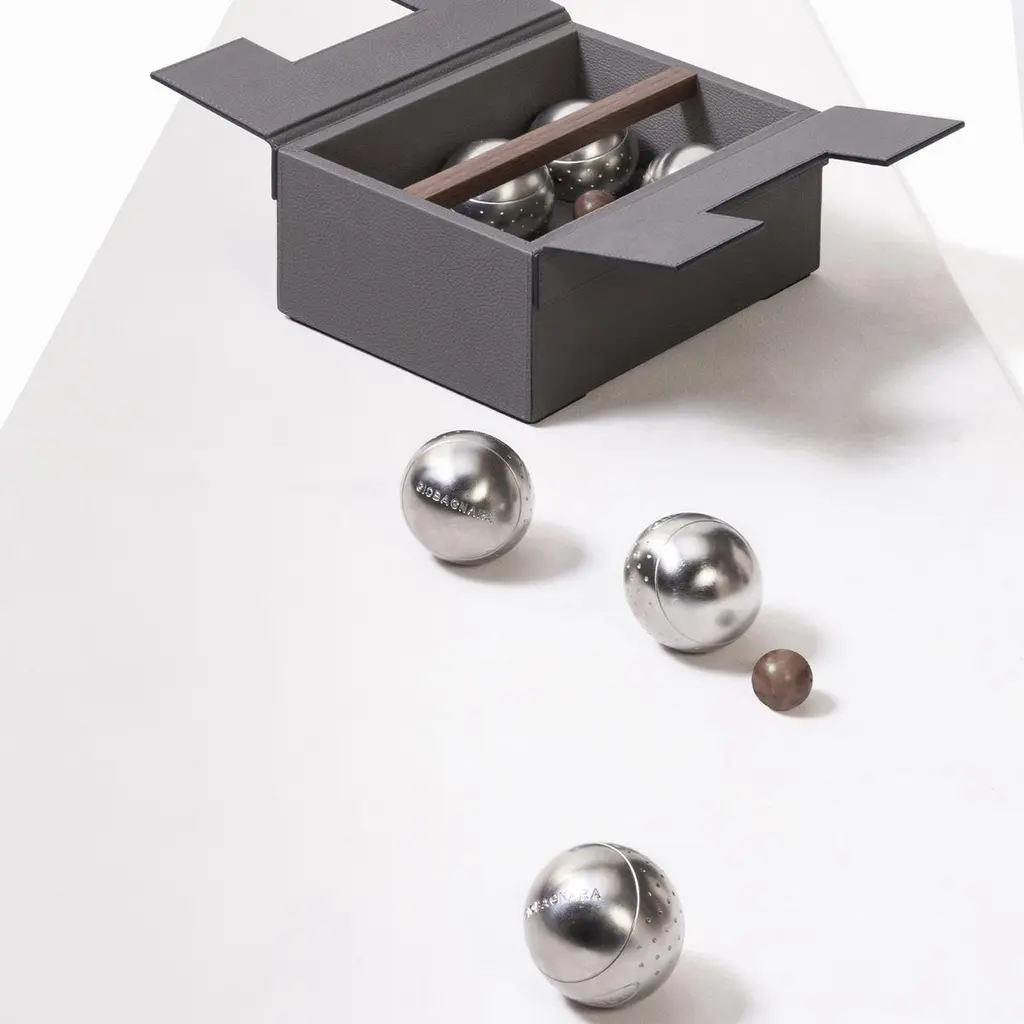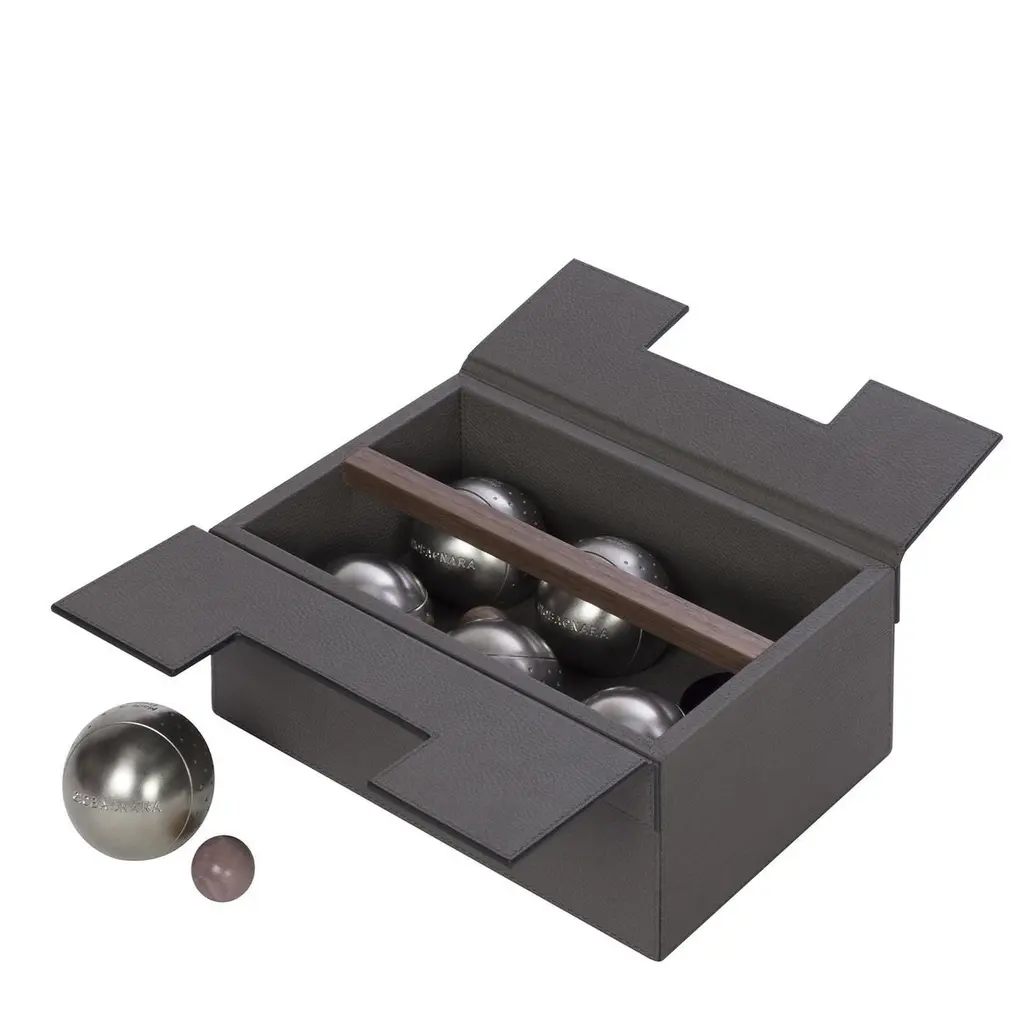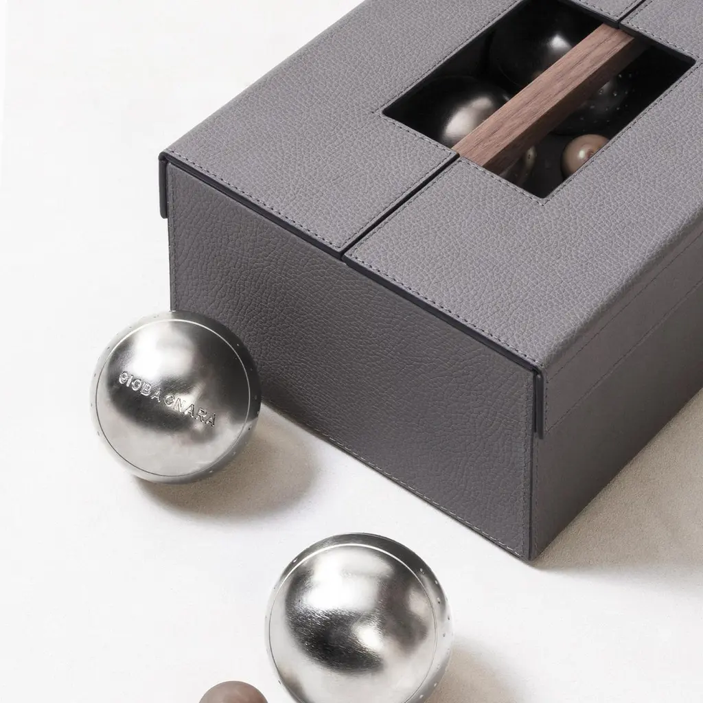 Composed of six heavy stainless steel balls and two wooden jacks that serve as target balls, this exquisite bocce set comes in an elegant and original gray leather-covered wood box embellished with a solid walnut wood handle. This popular Mediterranean pastime makes the perfect gift to celebrate a new home and will be a most welcome addition to summer weekend getaways with friends. Customization in other colors is available upon request.
