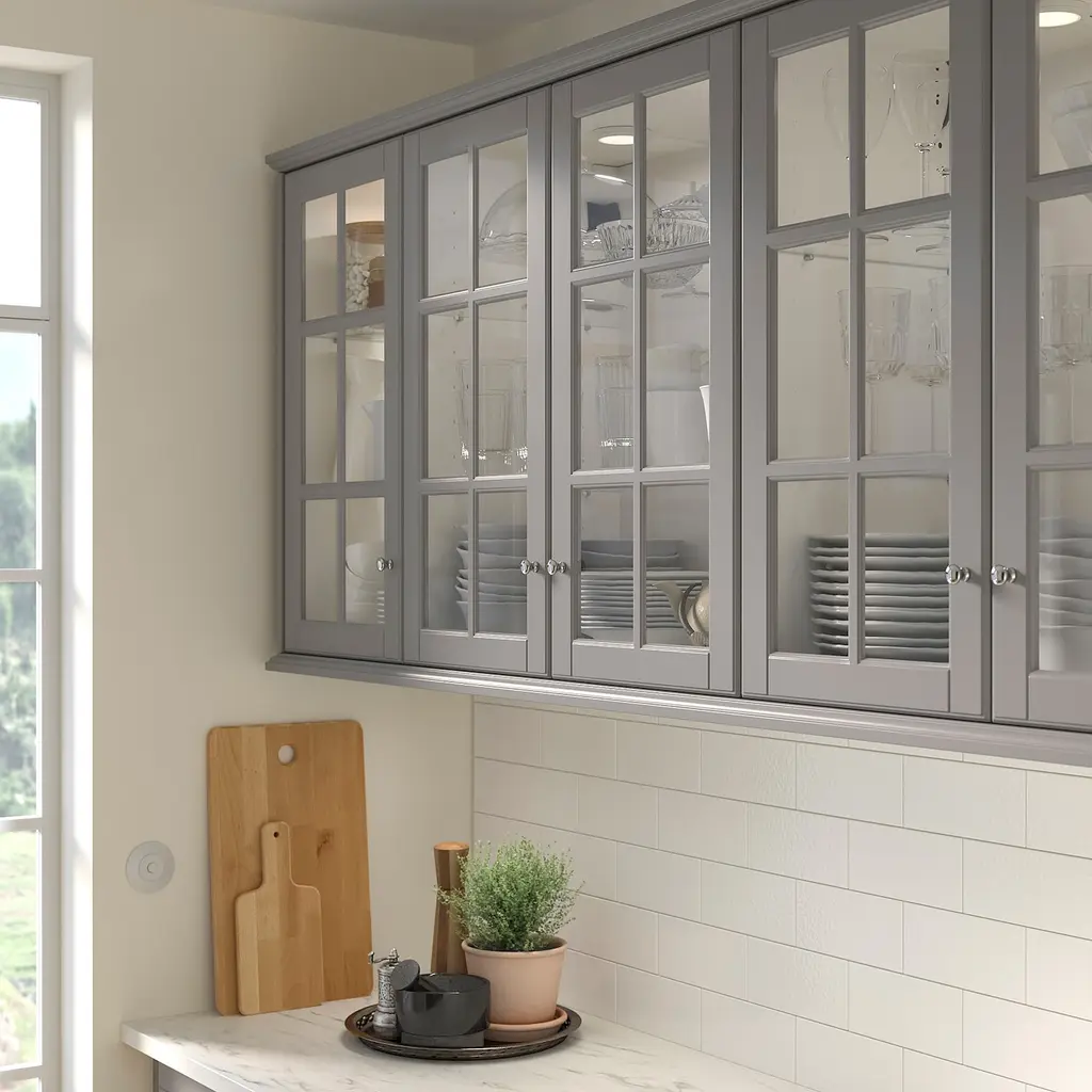BODBYN Glass door - gray 15x40 ". BODBYN door has a frame and a beveled panel that give it a distinct, traditional character. Soft gray brings a touch of sophisticated color to your kitchen. Lacquered doors are smooth and seamless, resistant to moisture and staining and very easy to keep clean.