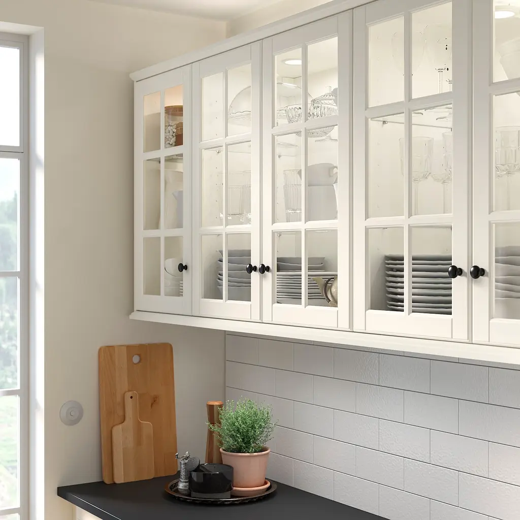 BODBYN Glass door - off-white 18x30 ". BODBYN door has a frame and a bevelled panel that give it a distinct, traditional character. Creamy off-white brings a bright, warm touch to your kitchen. Lacquered doors are smooth and seamless, resistant to moisture and staining and very easy to keep clean.