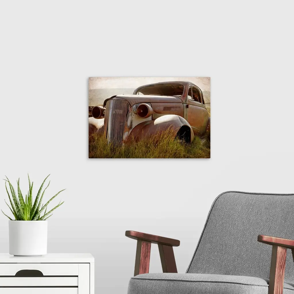 Photograph of a broken down and beat up vintage car in a junkyard.