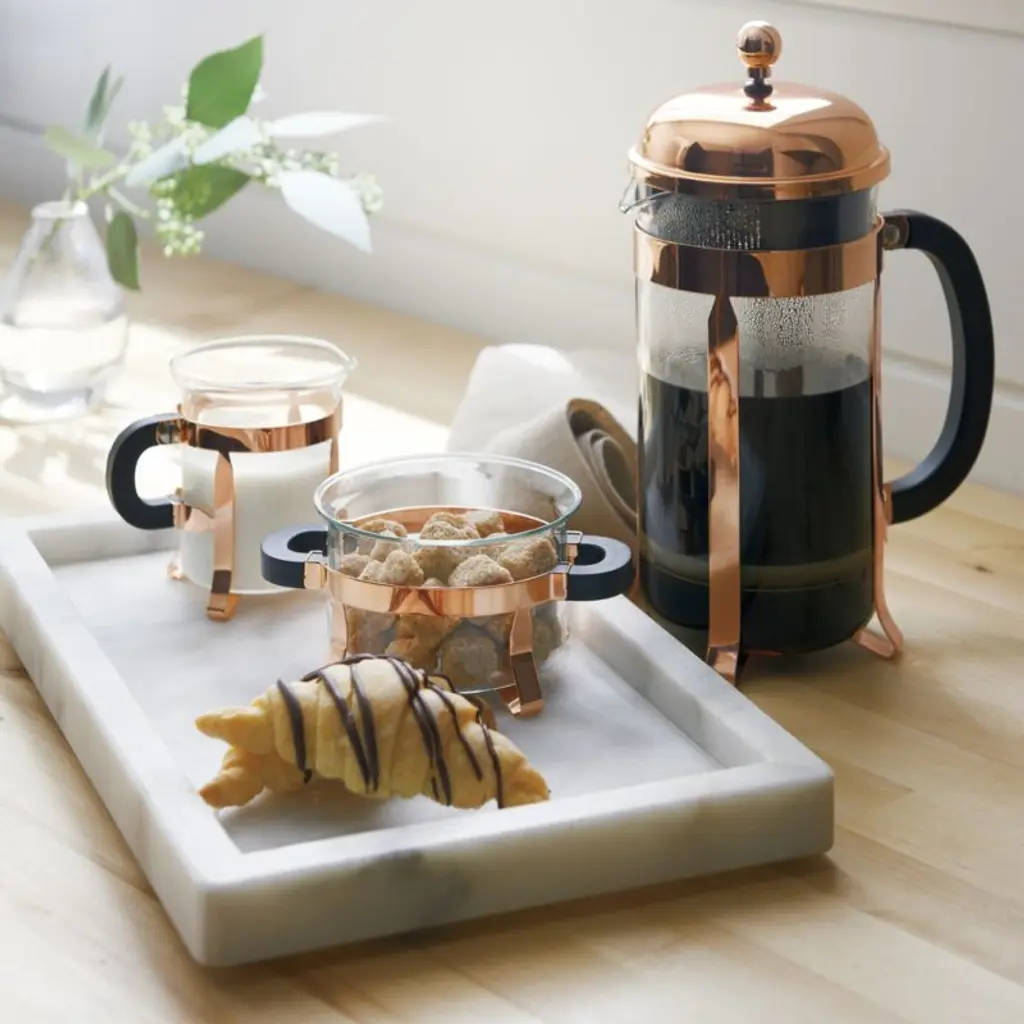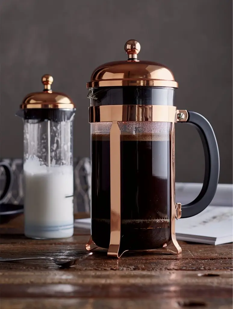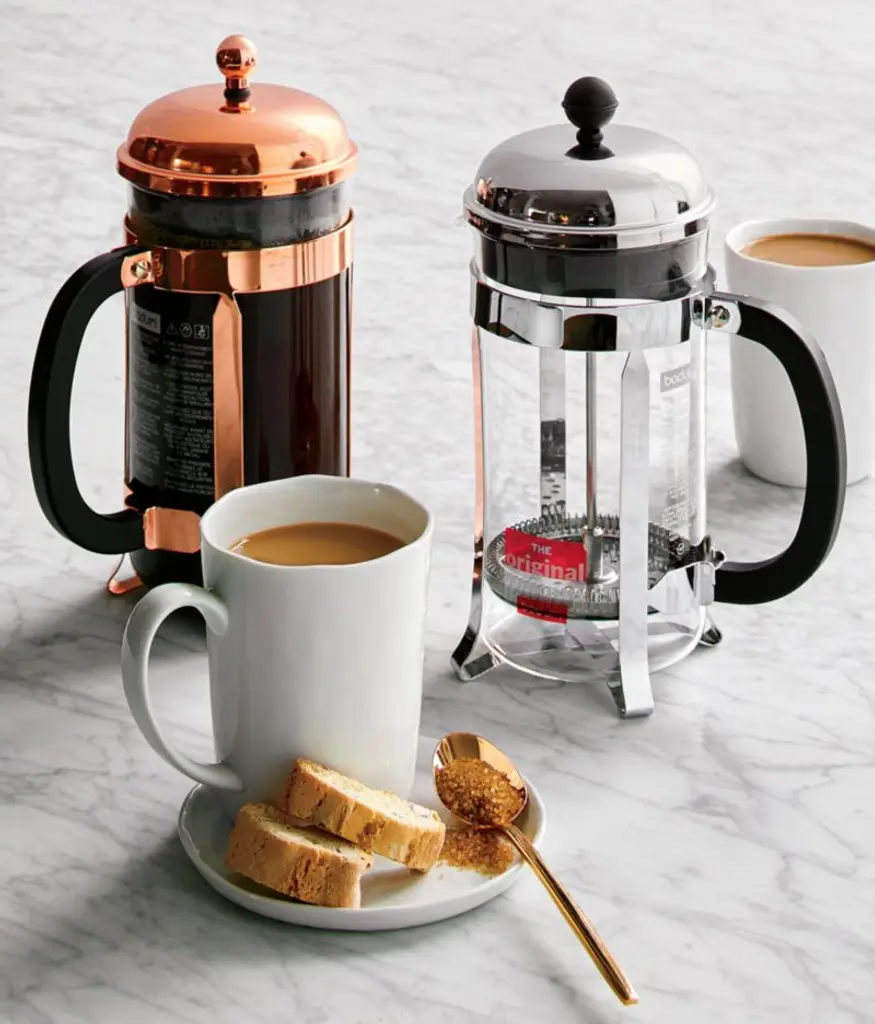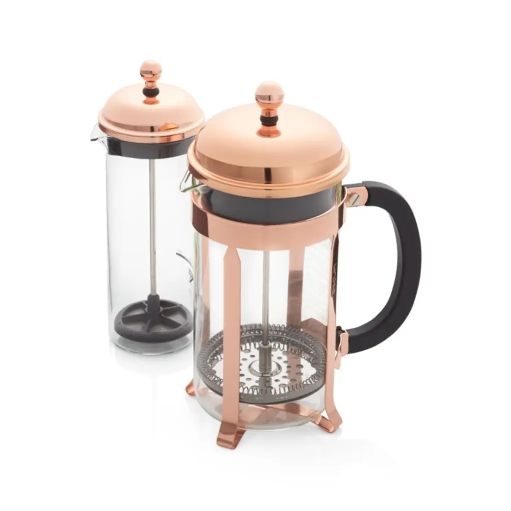 The signature dome-topped Bodum French press coffee maker takes on a beautiful copper-plated finish in this classic plunger-style brewing method revered for producing fresh coffee with rich, full-bodied character. Bodum took over a small clarinet factory in Normandy in 1982 not for the musical instruments but for their relatively unknown Chambord coffee maker. Combining the skills of the local craftsman with modern production, French press became accessible and affordable to the legions of fans who love the taste of the coffee brewed in this unique coffee style. Tested best by the American Culinary Institute, this classic, beautiful and simple design is recognized worldwide as one of the best ways to brew coffee in just four minutes. Coffee maker with a 34-ounce capacity is outfitted with a patented safety lid.Learn the different techniques behind a great cup of coffee with our guide to brewing.