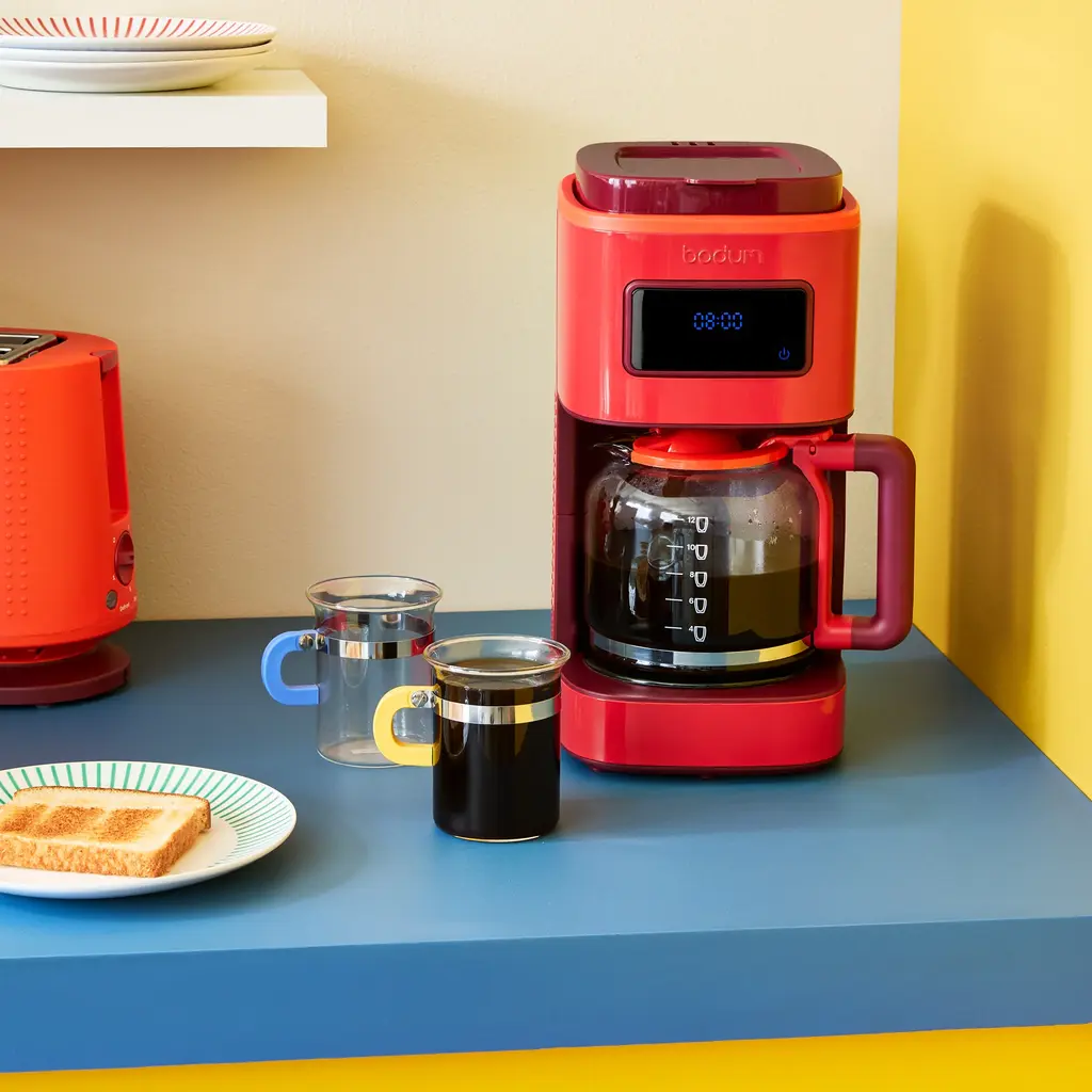 MoMA Exclusive: Your daily coffee needs, perfected. With this coffee maker from Bodum, you can program coffee to brew up to 24 hours in advance, and the machine will shut off automatically 25 minutes after brewing is complete. It features an easy-to-read LED screen and a brewing system that uses a shower head to distribute water evenly, creating a well-balanced flavor. Plus, this version of the Bodum Programmable 12-Cup Coffee Maker is produced in colors chosen exclusively for our customers.Features of the Bodum Programmable 12-Cup Coffee Maker include: Programmable up to 24 hours in advance. Auto-shutoff after 25 mins. The carafe has an easy-grip, no-slip handle. Permanent stainless steel coffee filter eliminates the waste of paper filters. Brewing system uses a shower head to distribute water evenly, creating a well-balanced flavor. Powered by standard plug in with a 30" cord. 120 watts. Made from borosilicate glass, stainless steel & plastic. Top-rack dishwasher-safe: shower head, filter holder, coffee filter, spoon, glass carafe and carafe lid. Wipe body clean with damp cloth. MoMA Exclusive colors. Measures 13.75h x 6.9w x 8.5”d.