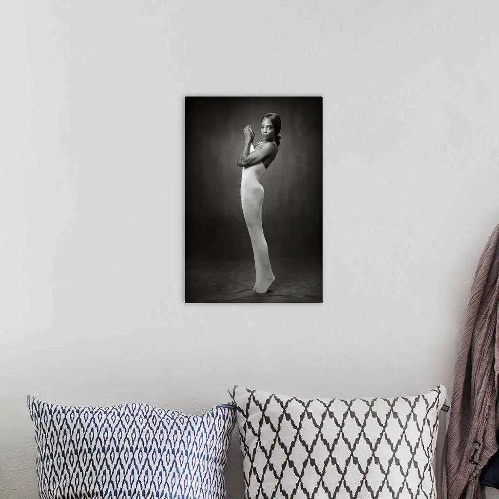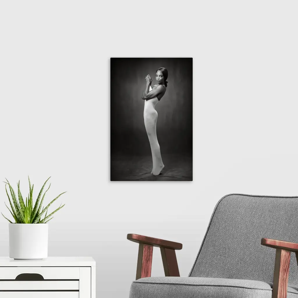 Elegant black and white photograph of a nude woman wearing a tight body sock.