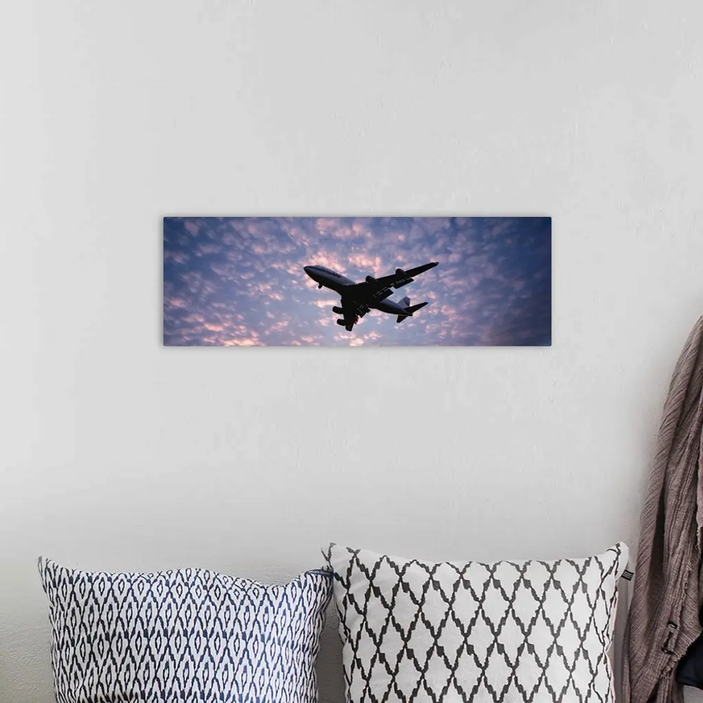 Panoramic photograph showcases the near silhouette of a wide-body commercial airliner and cargo transport aircraft flying through a slowly approaching nighttime sky as scattered clouds hover above.