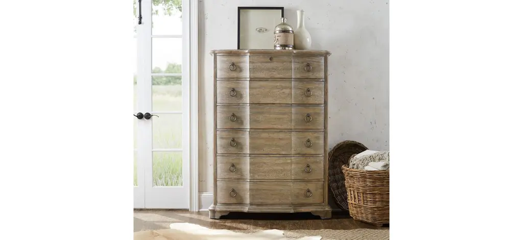 With organic beauty and a softly shaped silhouette, the Boheme Chest is finished in the sophisticated Antique Milk Paint, a light brown finish with nearly opaque antique milk-colored overcoat offering a brush-painted effect. With six drawers and a drop-in felt liner in the top two drawers, the bottom drawer is cedar-lined.