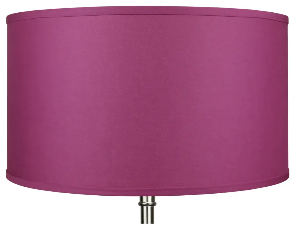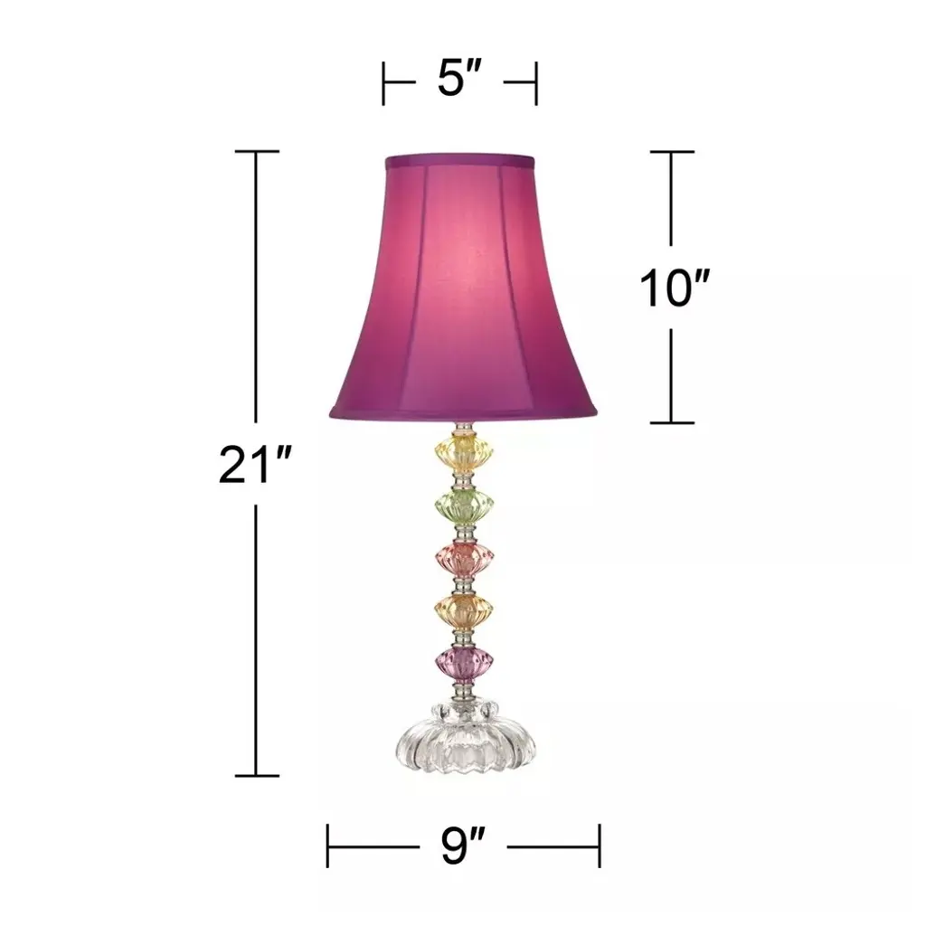 PRODUCT DETAILS: 21" high overall. Shade is 5" across the top x 9" across the bottom x 10" high. Weighs 3.4 lbs. Uses one maximum 60 watt standard-medium base Type A-19 bulb (not included). On-off socket switch. A fun accent for a side or hallway table. Multi-color glass table lamp base with nickel finish metal accents. Deep pink-purple lamp shade. Uno style shade fitter. 6-foot long cord.