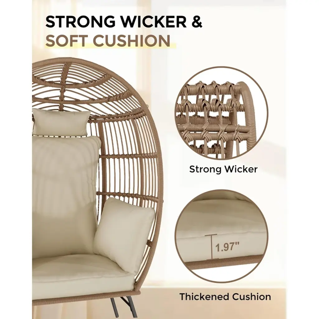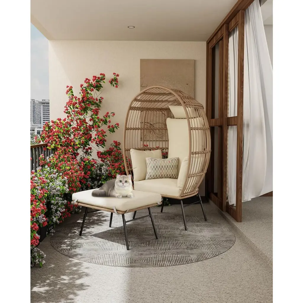 Bohemian Rattan Egg Chair with Ottoman - PE Wicker Patio Lounge Chair for Outdoor, Waterproof & UV-Resistant Hanging Egg Chair for Garden, Porch, Poolside - Beige Boho Hanging Chair with Cushions