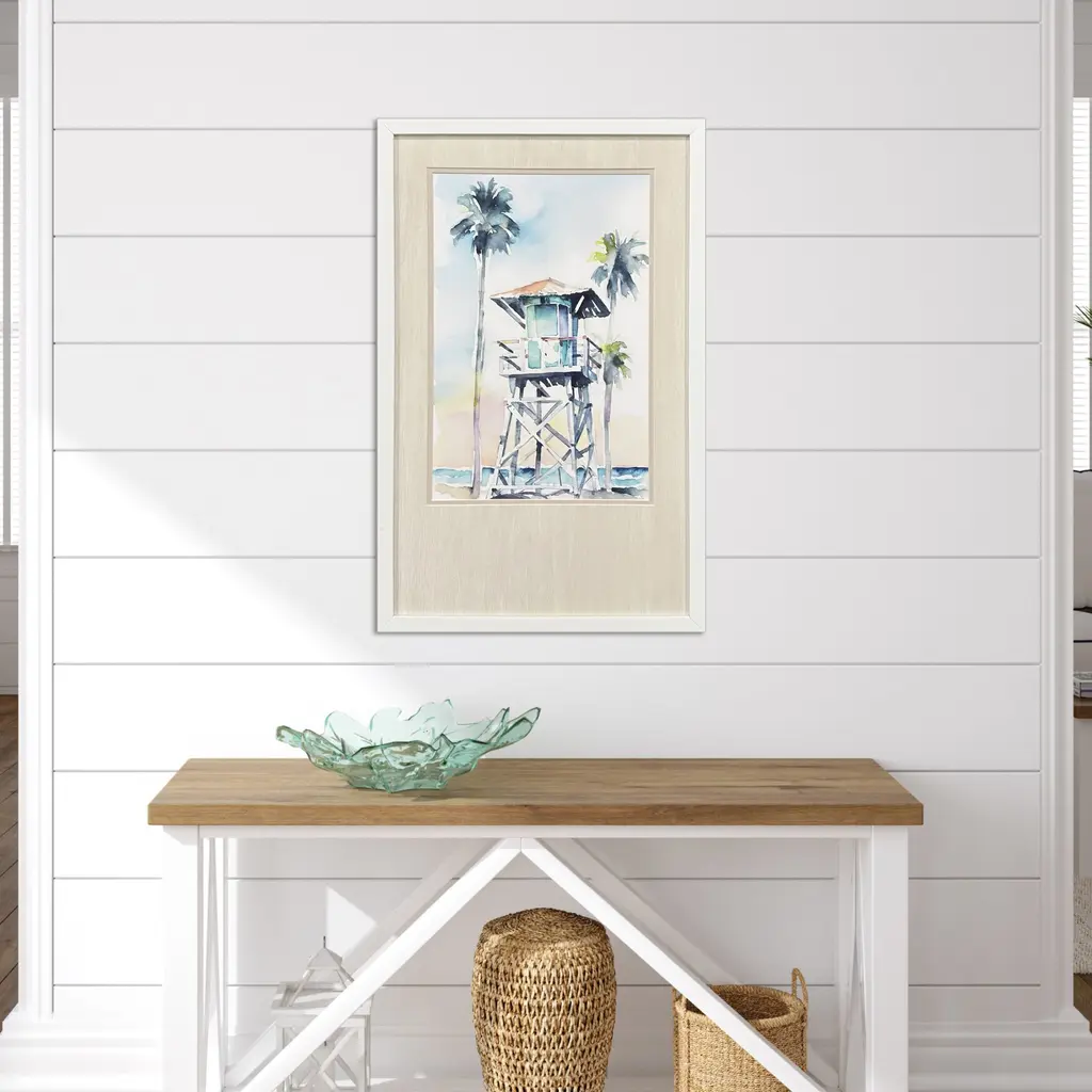 A tropical beach watchtower print is highlighted with offset premium matting. Framed in a modern flat profile moulding in a matte white finish.
